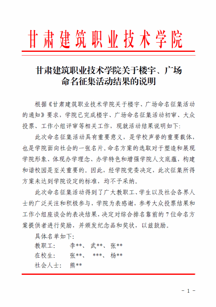 甘肃建筑职业技术学院关于楼宇、广场命名征集活动结果的说明