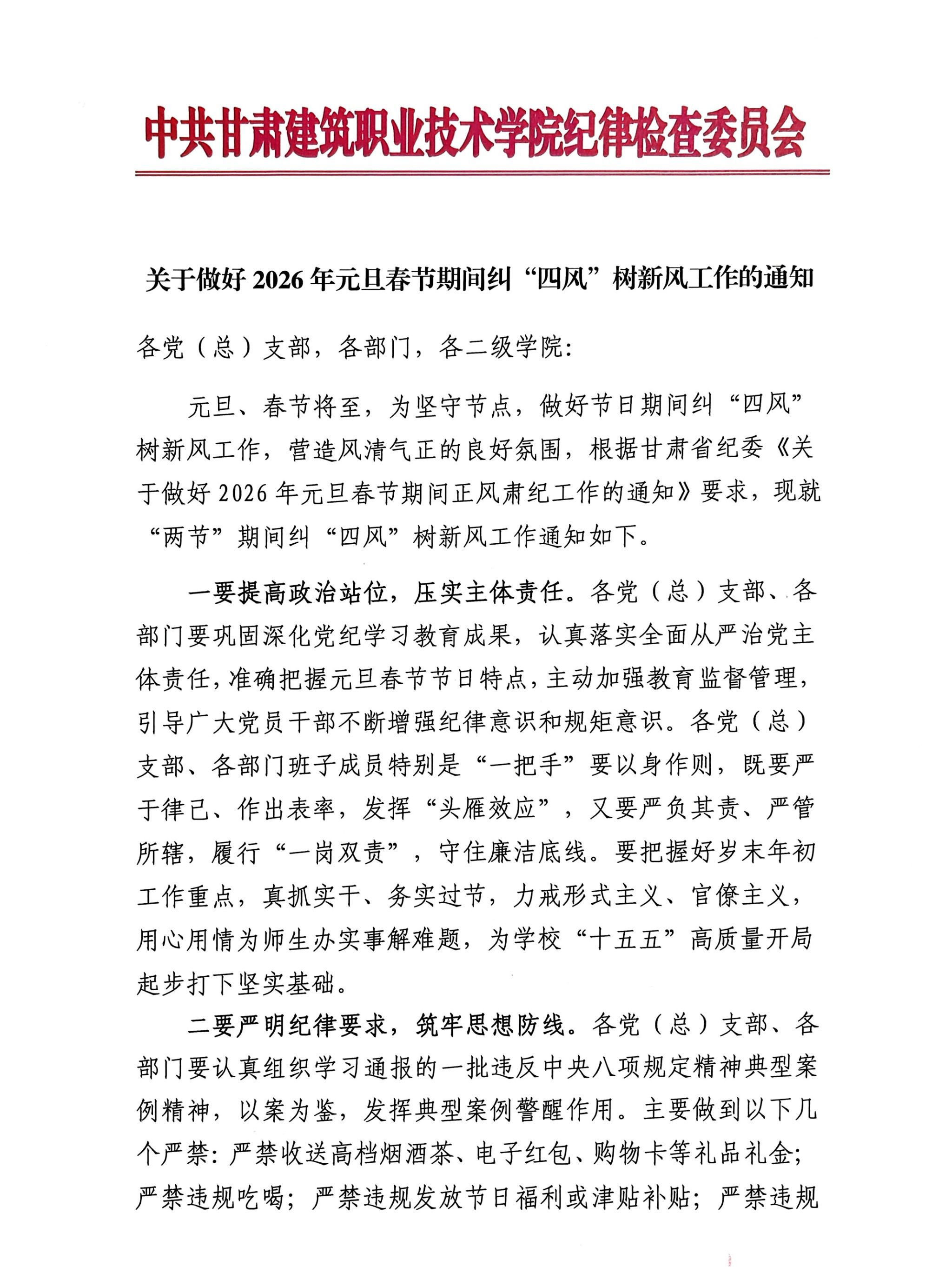 关于做好2026年元旦春节期间纠“四风”树新风工作的通知