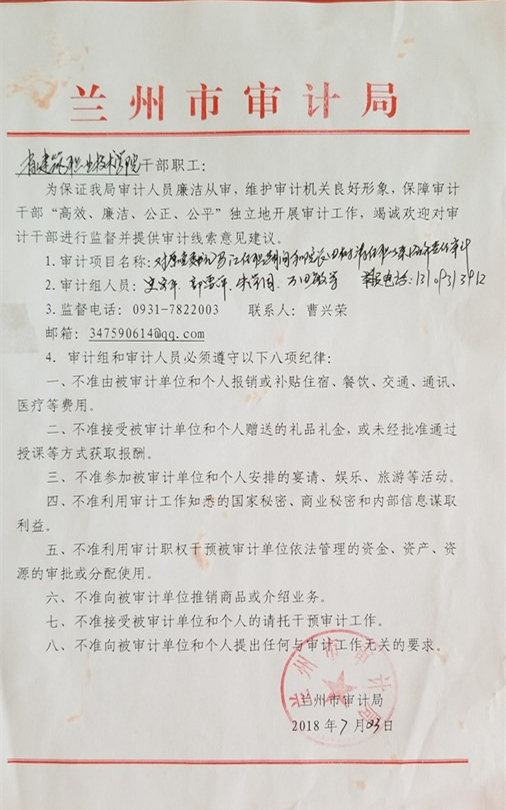 兰州市审计局关于对原学院党委书记马江任职期间和院长田树涛任职以来经济责任履行情况审计的公告 日期:2018-09-12 来源: 1111MicrosoftInternetExplorer402DocumentNotSpecified7.8 磅Normal0 甘肃建筑职业技术学院干部职工: 为保证我局审计人员廉洁从审,维护审计机关良好形象,保障审计干部“高效、廉洁、公正、公平”独立地开展审计工作,竭诚欢迎对审计干部进行监督并提供审计线索意见建议。 举报电话:13109313912 兰州市审计局 2018年9月7日