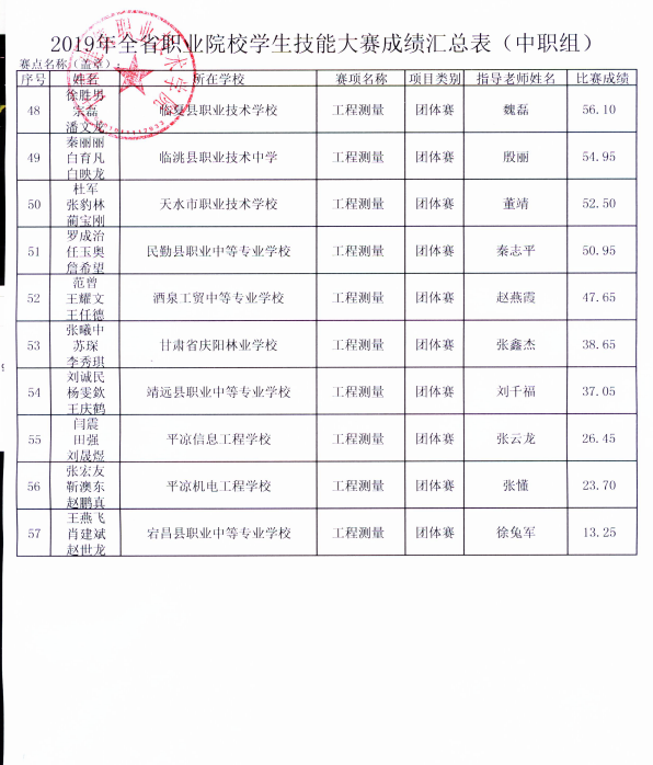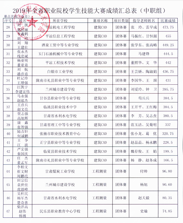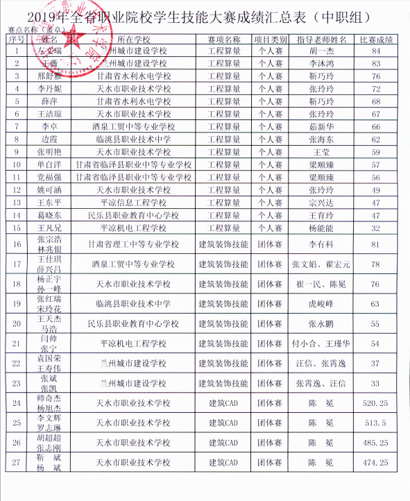 2019年甘肃省职业院校学生技能大赛甘肃建筑职业技术学院赛点成绩表(中职组) 日期:2019-03-29 来源: 如果您无法在线浏览此 PDF 文件,则可以 下载免费小巧的 福昕(Foxit) PDF 阅读器,安装后即可在线浏览 或 下载免费的 Adobe Reader PDF 阅读器,安装后即可在线浏览 或 下载此 PDF 文件