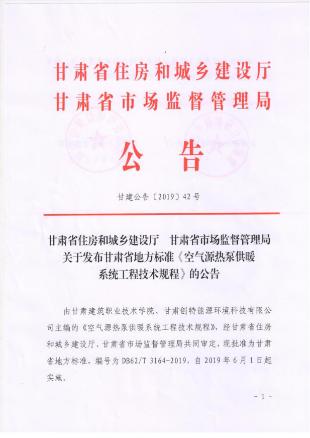 近日,学院作为主编单位编写的甘肃省地方标准《空气源热泵供暖系统工程技术规程》,经甘肃省住房和城乡建设厅、甘肃省市场监督管理局共同审定,批准为甘肃省地方标准,标准编号DB62/T3164-2019,自2019年6月1日起在全省范围内实施。学院岳亭龙老师主持了规程起草工作。
