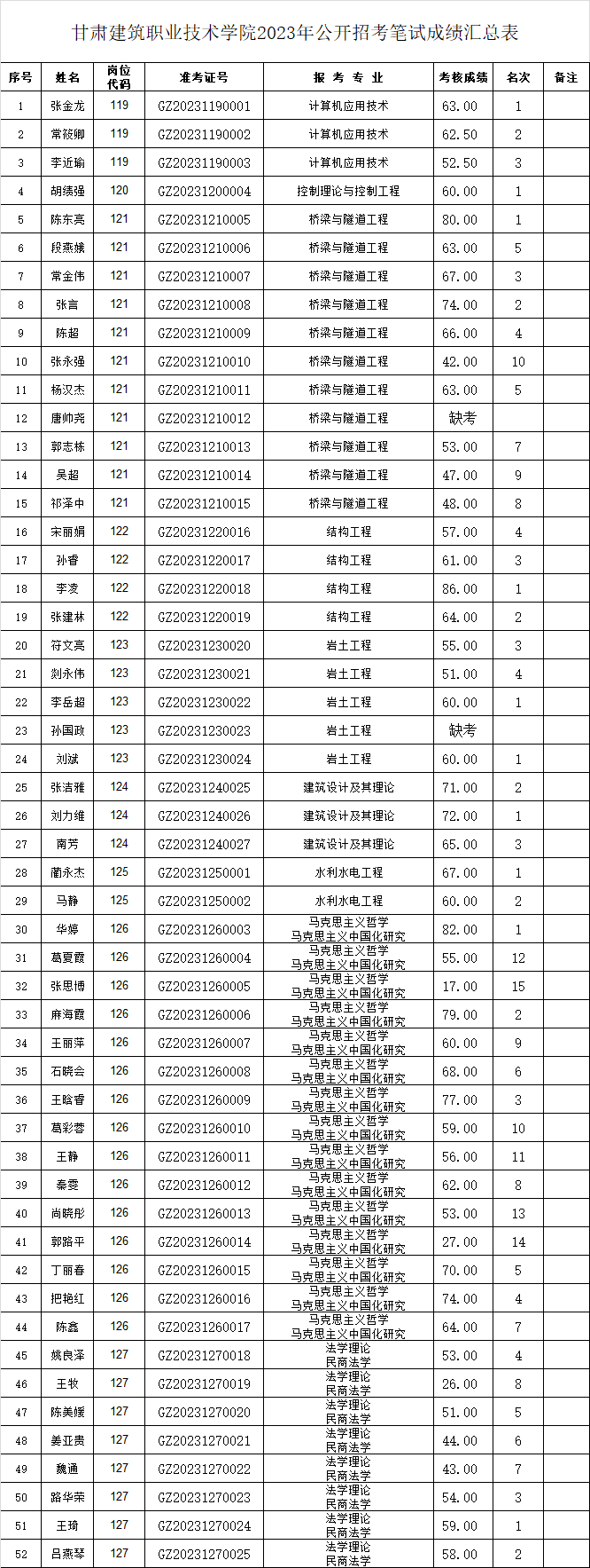 甘肃建筑职业技术学院2023年公开招聘笔试成绩公示 日期:2023-12-07 来源: 我院2023年面向应届毕业生和离校2年内未就业的高校毕业生公开招聘专业技术工作人员15人。招聘笔试于2023年12月3日进行,现对笔试成绩面向全社会进行公示,接受监督,笔试成绩详见附件。 公示时间:2023年12月7日—13日 公示方式:网络公示 监督电话:0931-2394169 甘肃建筑职业技术学院 2023年12月7日 附件【甘肃建筑职业技术学院笔试成绩表.xls】已下载次