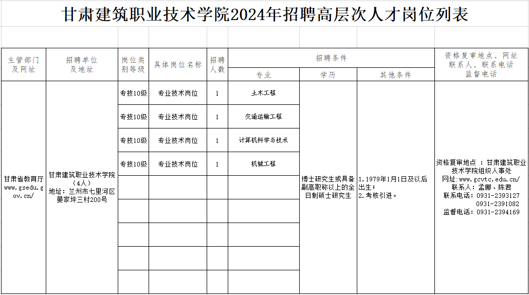 本次计划招聘高层次人才4人,具体岗位及联系方式见《甘肃建筑职业技术学院2024年公开考核招聘高层次专业及岗位列表》。