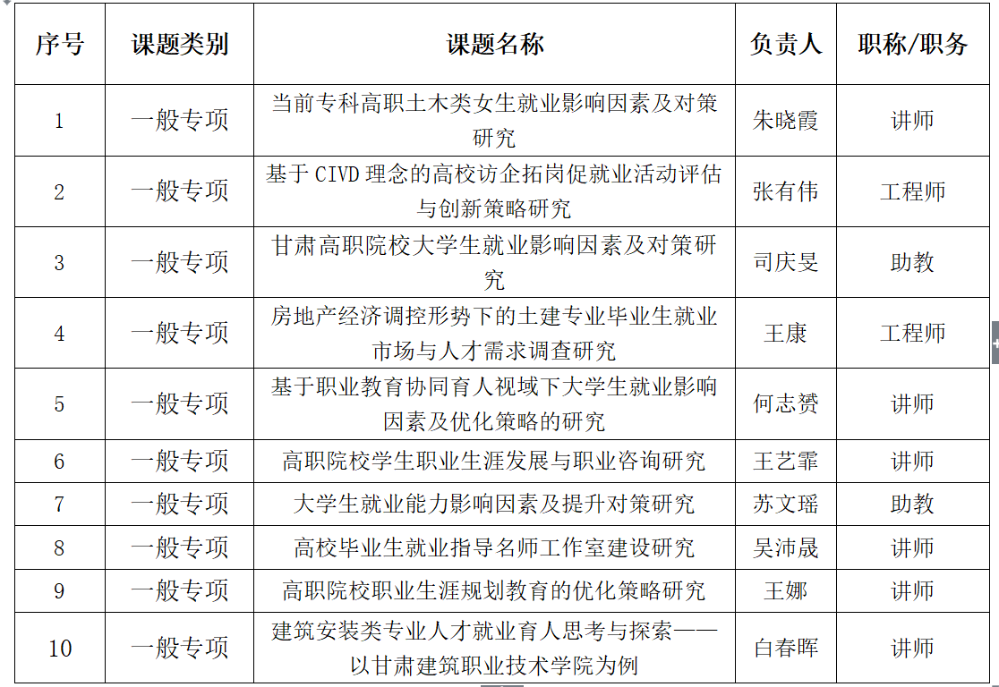 根据《关于组织开展甘肃省教育科学“十四五”规划2024年度“大学生职业规划与就业指导”专项课题立项申报工作的通知》(甘教规划办〔2024〕3号)文件要求,经个人申请,学院审查,拟推荐“当前专科高职土木类女生就业影响因素及对策研究”等10项课题申报甘肃省教育科学“十四五”规划2024年度“大学生职业规划与就业指导”专项课题,现予以公示。