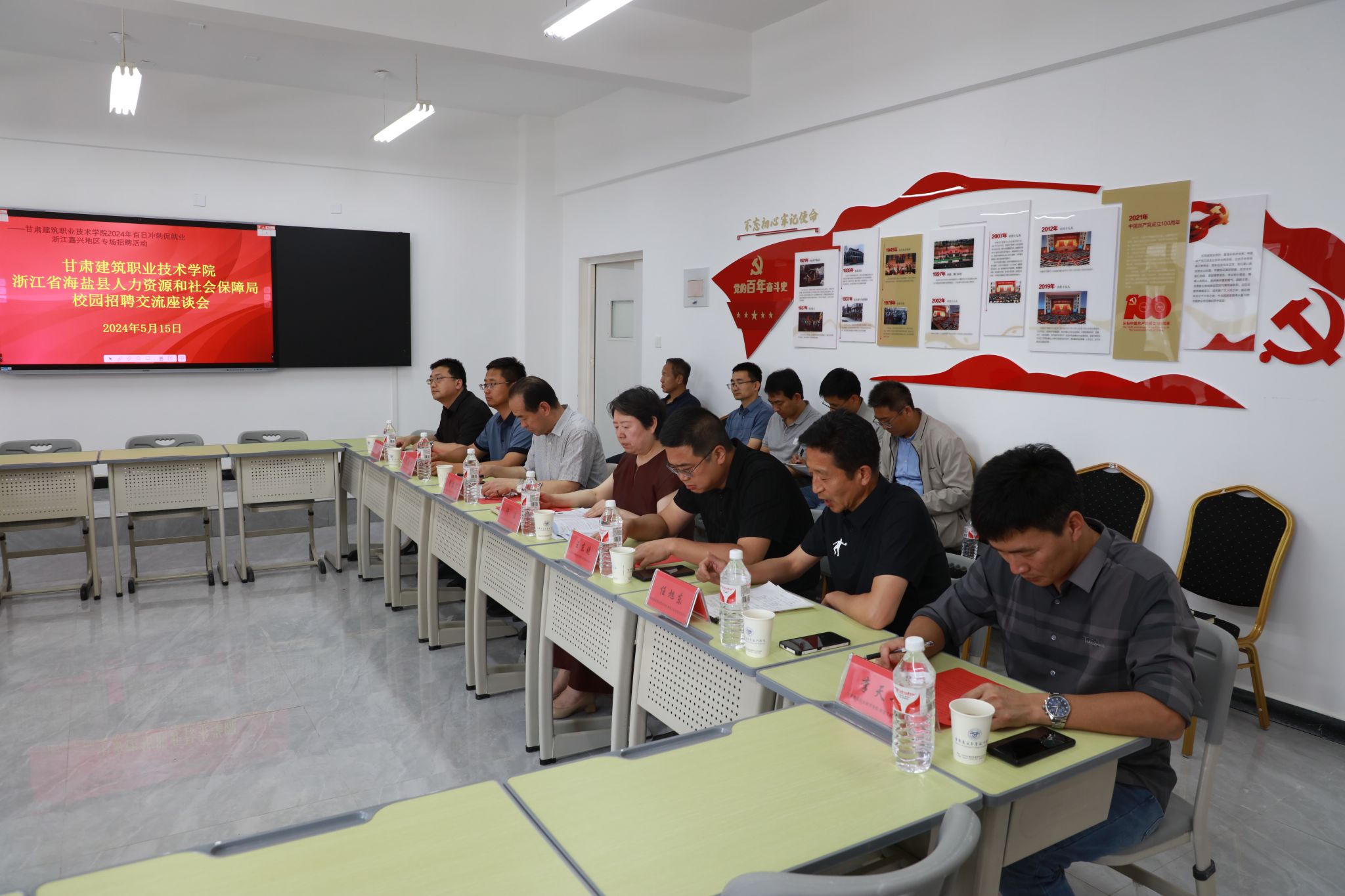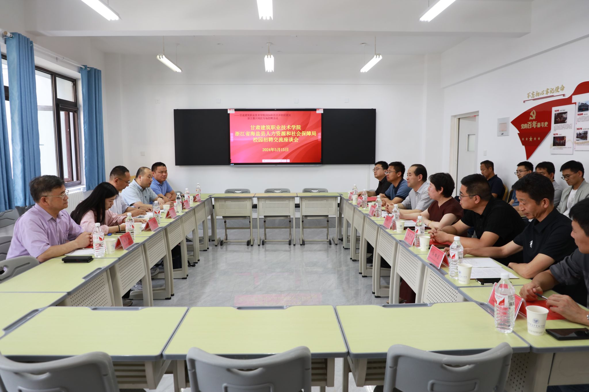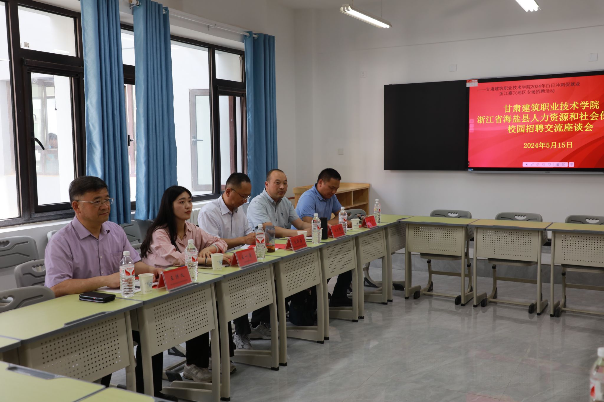 5月15日,学院建筑工程系邀请浙江省海盐县人力资源和社会保障局及当地9家企业来校开展校园招聘,并召开了交流座谈会。海盐县人力资源和社会保障局党委委员、副局长朱华海,就管中心主任赵沈军,海盐望海商会秘书长王一莲,浙江奥桑机械设备有限公司总经理王洪义,兰州理工大学机电工程学院党委委员、机械制造及其自动化系主任刘俭辉,甘肃建筑职业技术学院党委委员、副院长李君宏、许洁,教务处处长高建兴,招生就业处处长王东晓参加座谈会。建筑工程系班子成员及相关专业带头人参会,会议由建筑工程系党总支书记任旭东主持。