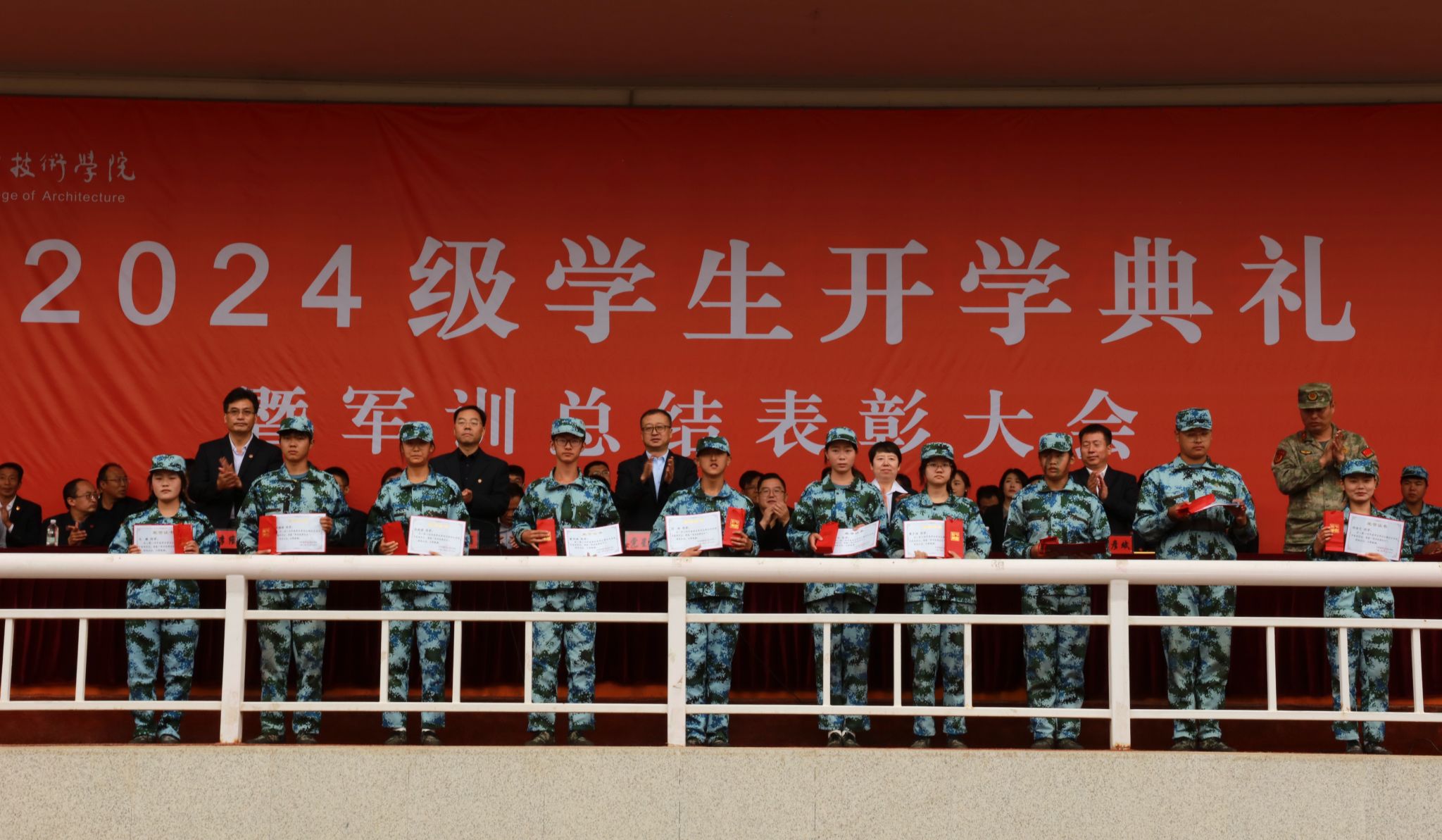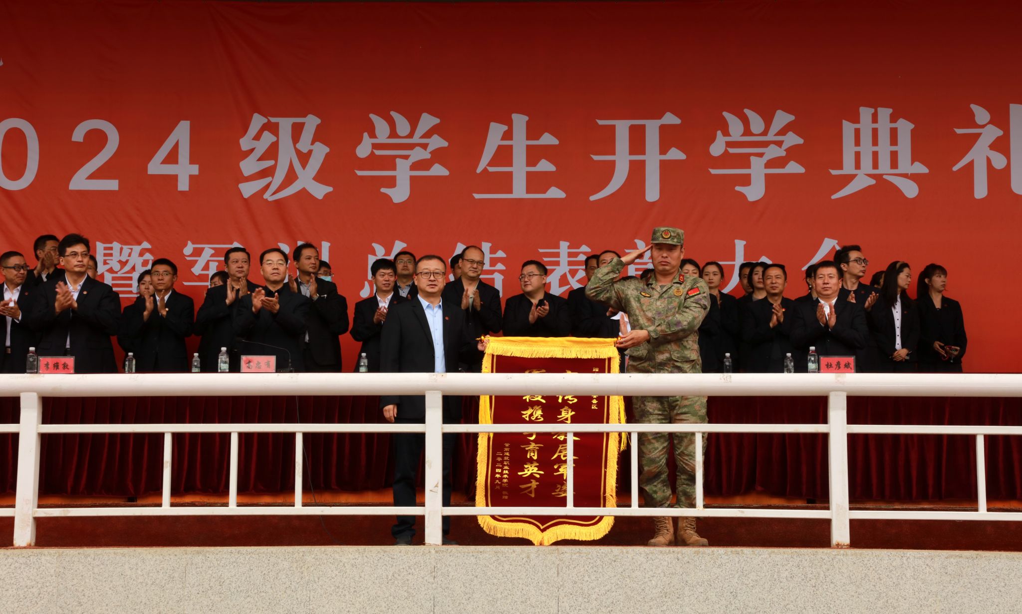 高忠有同志宣读了先进集体及先进个人的表彰文件,主席台领导和嘉宾为获奖集体和个人颁奖。党星海同志为承训部队赠送锦旗,表达了对合作单位的衷心感谢。随后,进行了2024级学生开学典礼。党星海为2024级学生代表颁发学生证、校徽和《学生手册》,并请2024级全体学生佩戴校徽。