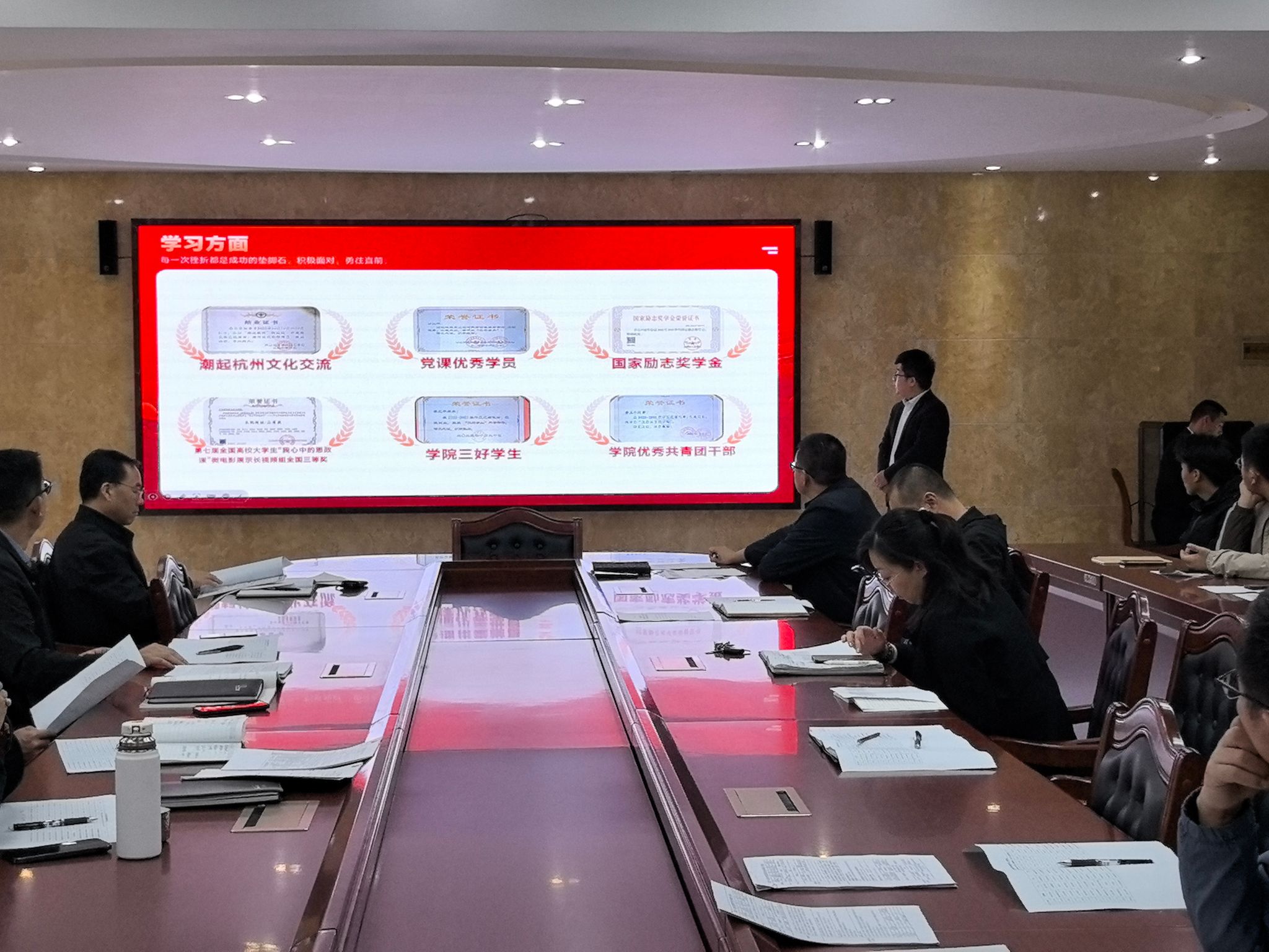 参会人员严格按照评选标准,仔细逐项审查国家奖学金申请推荐的学生的相关材料,12名同学现场进行汇报答辩,展示自己在思想品德、学习成绩、社会实践、创新能力、综合素质等方面的突出成绩,并对评审小组老师提出的问题予以回答。经过评审丁凯宇等12名同学符合国家奖学金申请条件、以实名投票方式表决,全体通过。