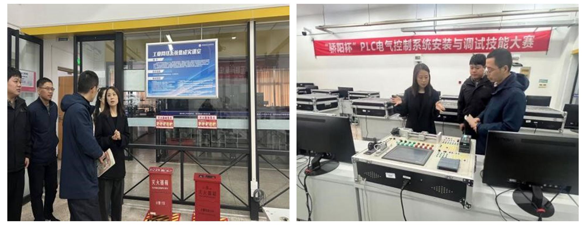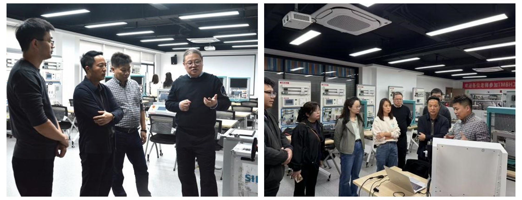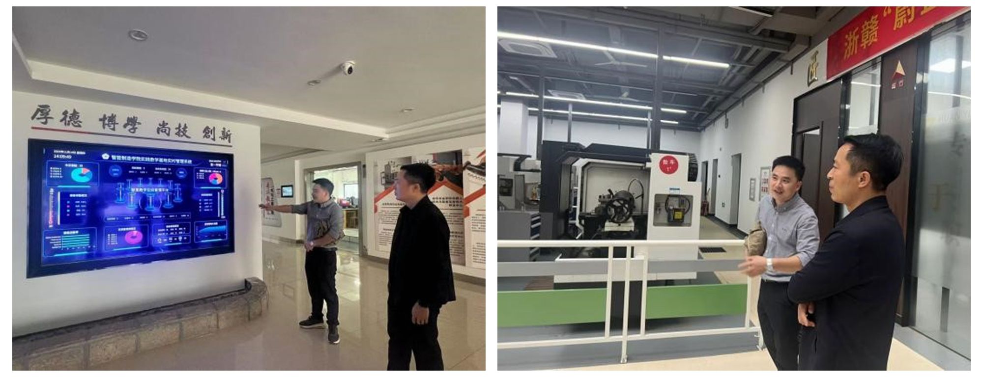 在金华职业技术大学智能制造学院,学院戴欣平院长详细介绍了学院的办学特色、专业设置及人才培养工作,与王成一行分享了学校“双高计划”建设及实训基地建设的成效与经验做法。双方座谈交流后,对校校合作及专业建设进行了实质探讨,并实地参观了电气自动化技术实训基地、智能化精密制造实训中心和工业机器人技术实训中心。