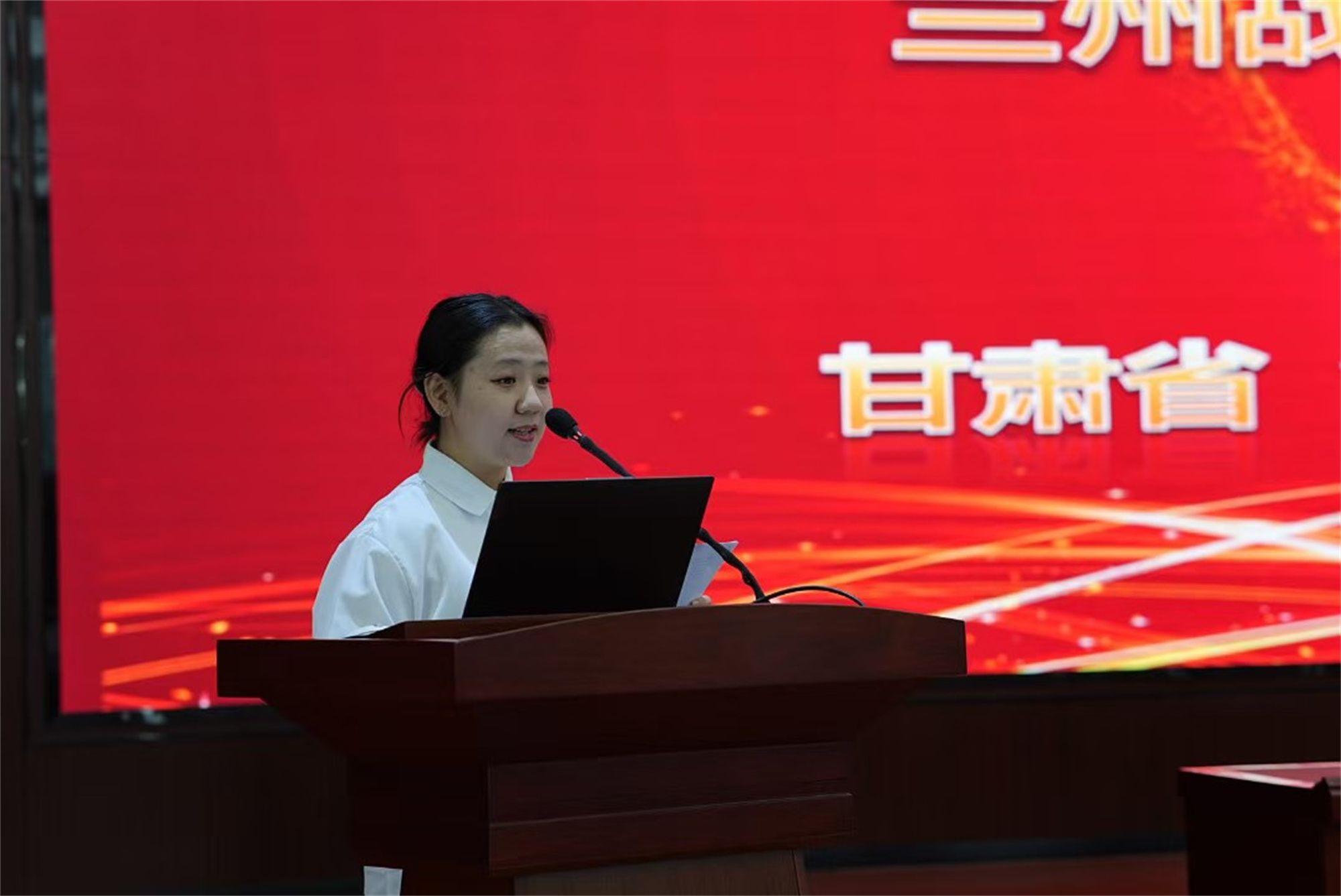学生志愿者代表赵冬宇,分享自己对兰州战役的理解与感悟,通过演讲兰州战役中的感人故事,展现红色精神的传承与发扬,进一步激发参会人员的爱国热情和奋斗精神。