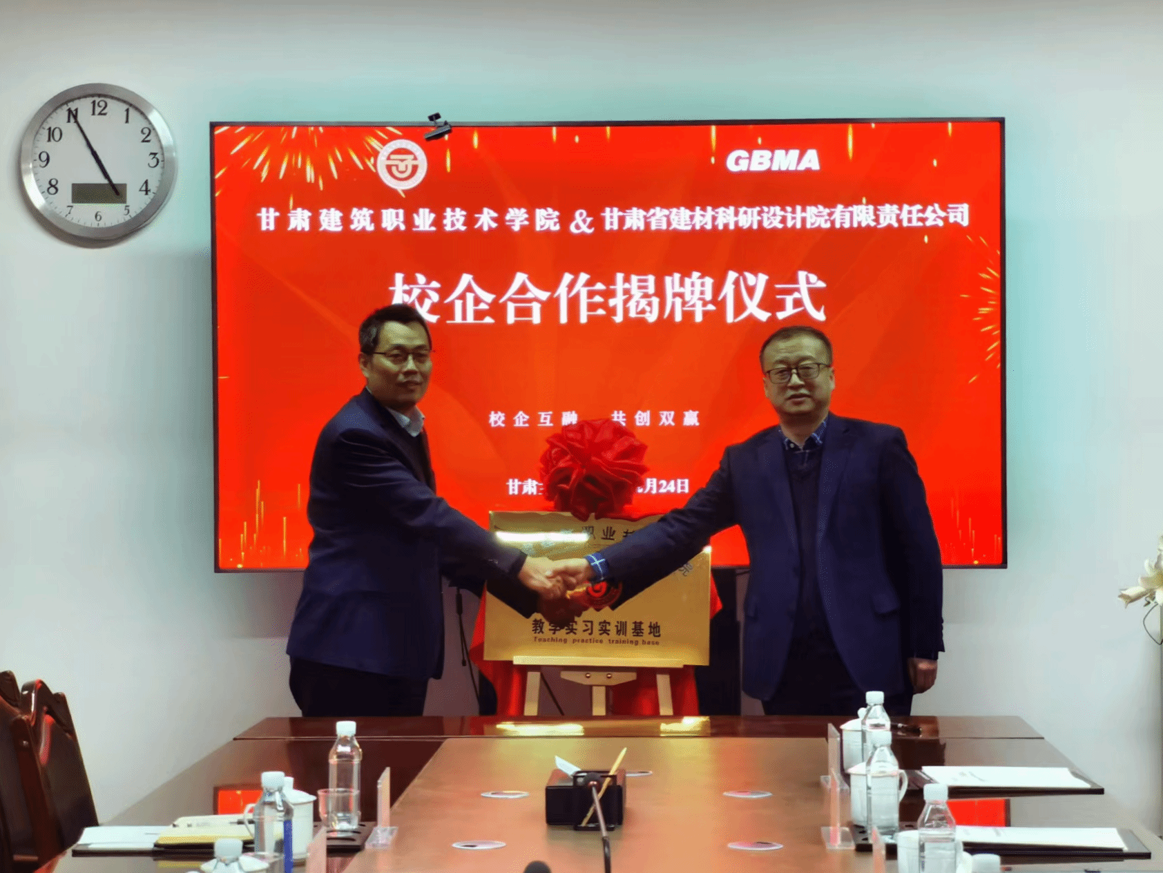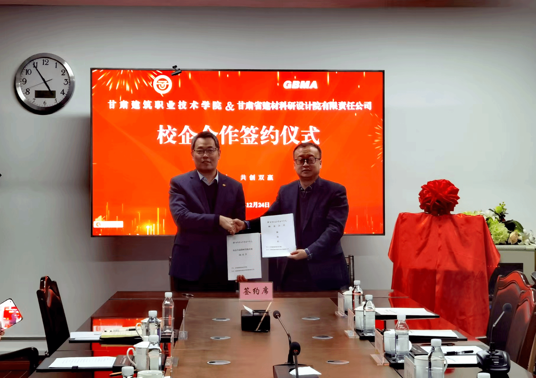 为深化职业教育与产业的协同发展,加速科研成果转化,培养符合市场需求的高素质技术技能人才。12月24日,我校与甘肃省建材科研设计院举行校企合作签约授牌仪式,党委副书记、校长党星海,党委委员、副校长李维敦,甘肃省建材科研设计院党委书记、董事长杨春雷及相关领导,我校办公室主任黄治学,教务处、科技处处长席攀锋,建筑工程学院副院长李斌等参加。