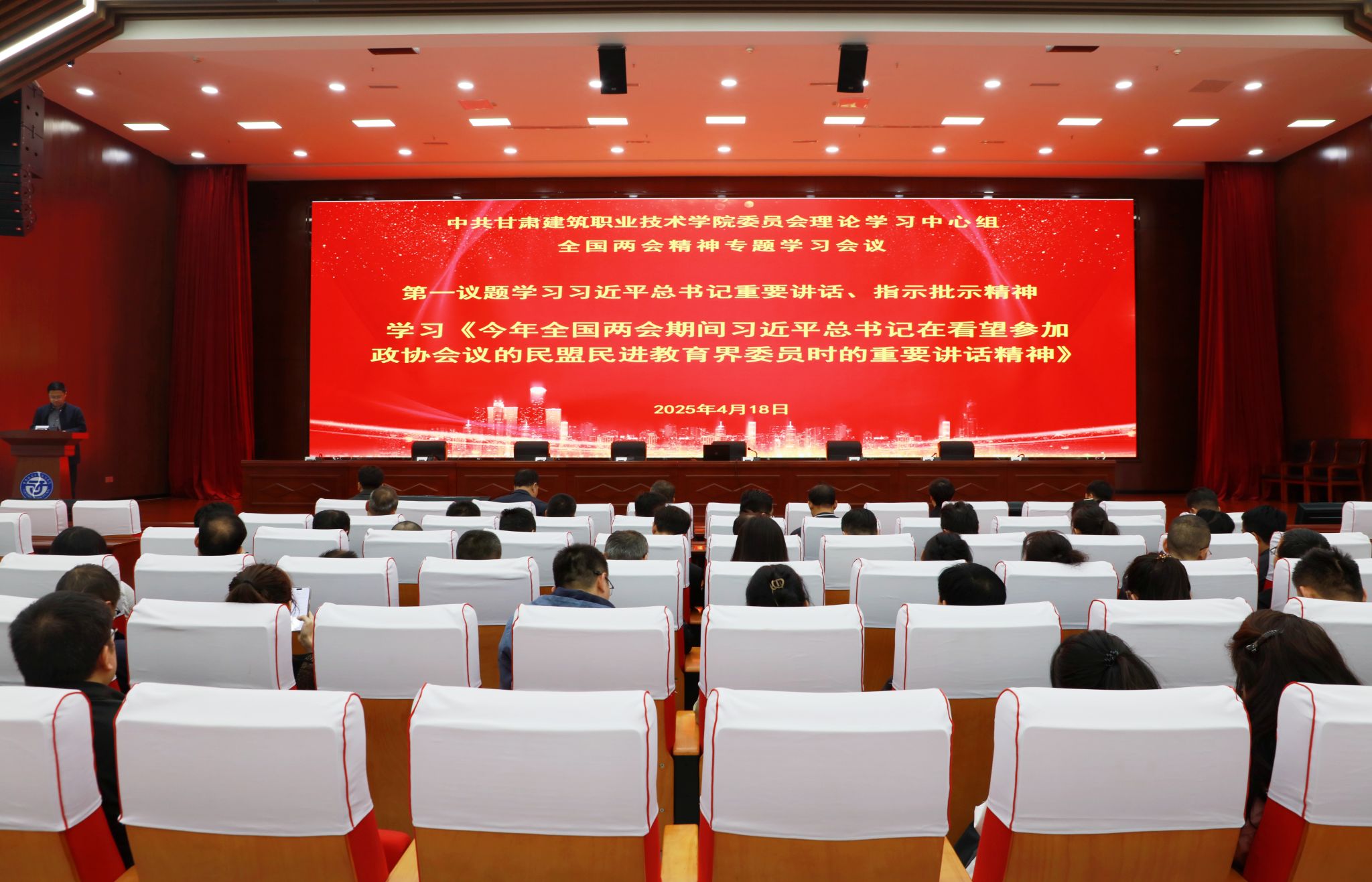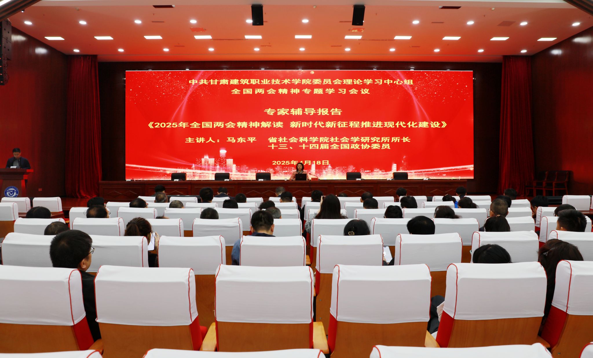 为全面深入学习贯彻全国两会精神,根据省委教育工委统一安排,4月18日,我校举办“理响校园 培根铸魂”全国两会精神示范性宣讲活动,邀请甘肃省社会科学院社会学研究所所长马东平现场做宣讲,学校党委书记王娟丽及领导班子成员,中心组全体成员,教师及学生代表现场聆听了宣讲。党委宣传统战部高建兴主持。