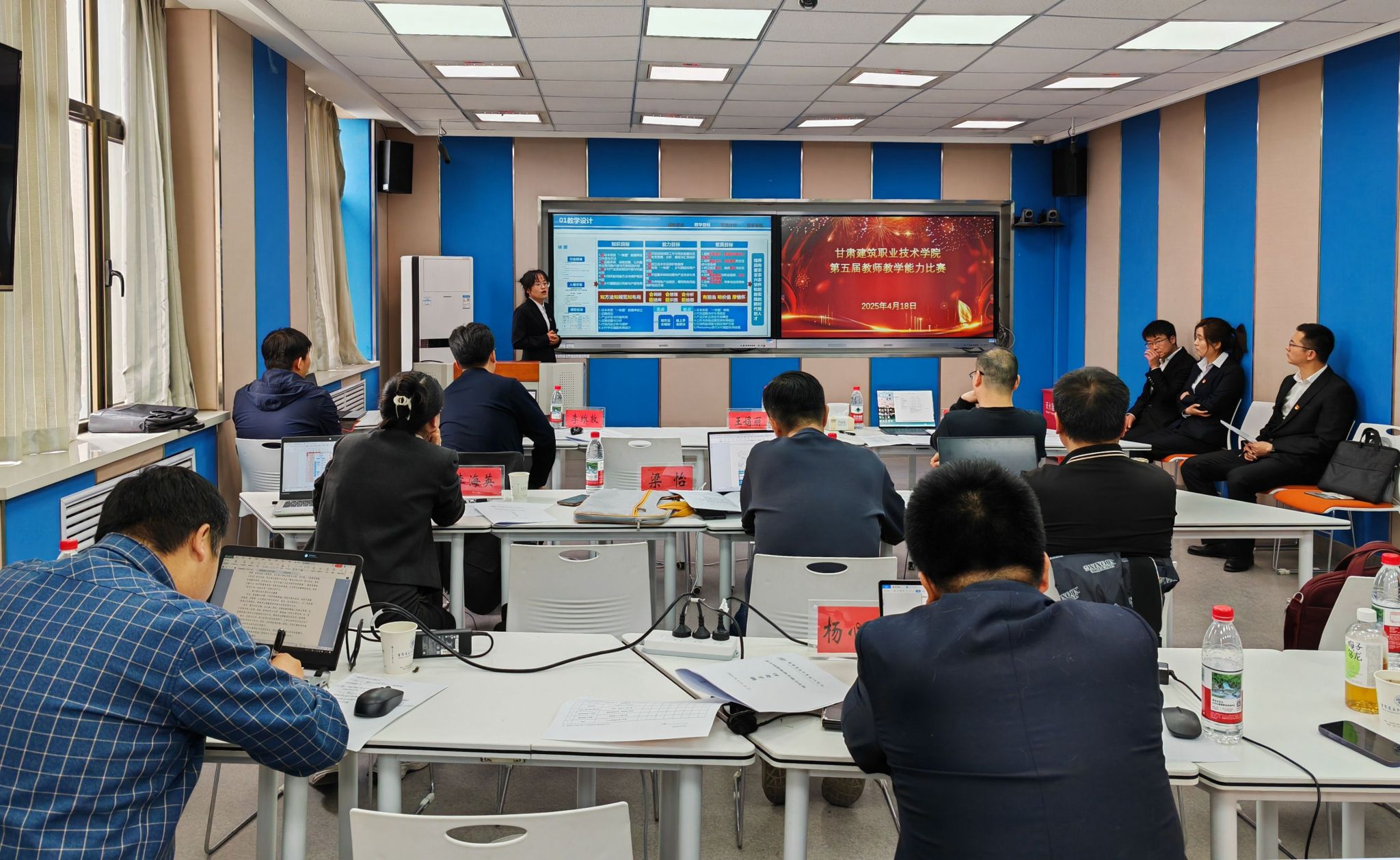 此次比赛对标甘肃省职业院校技能大赛教学能力比赛的要求和环节,分为专业课程一组、专业课程二组两个组别,各组别的教学团队首先介绍教学实施报告,然后针对抽选教案中的自选内容进行无学生教学展示,最后回答评审专家提问。