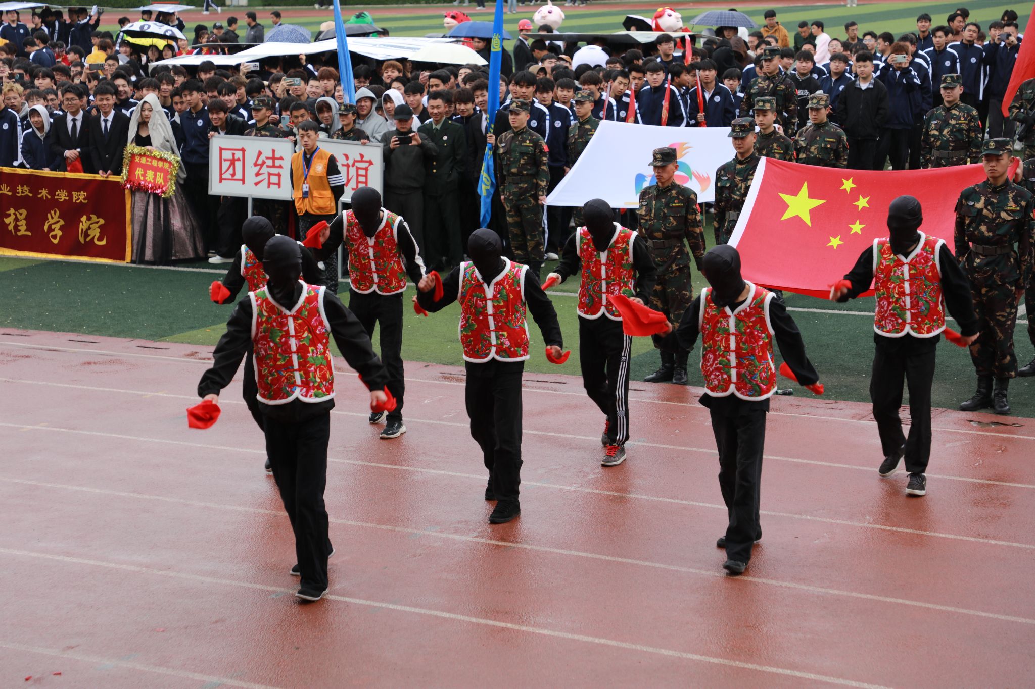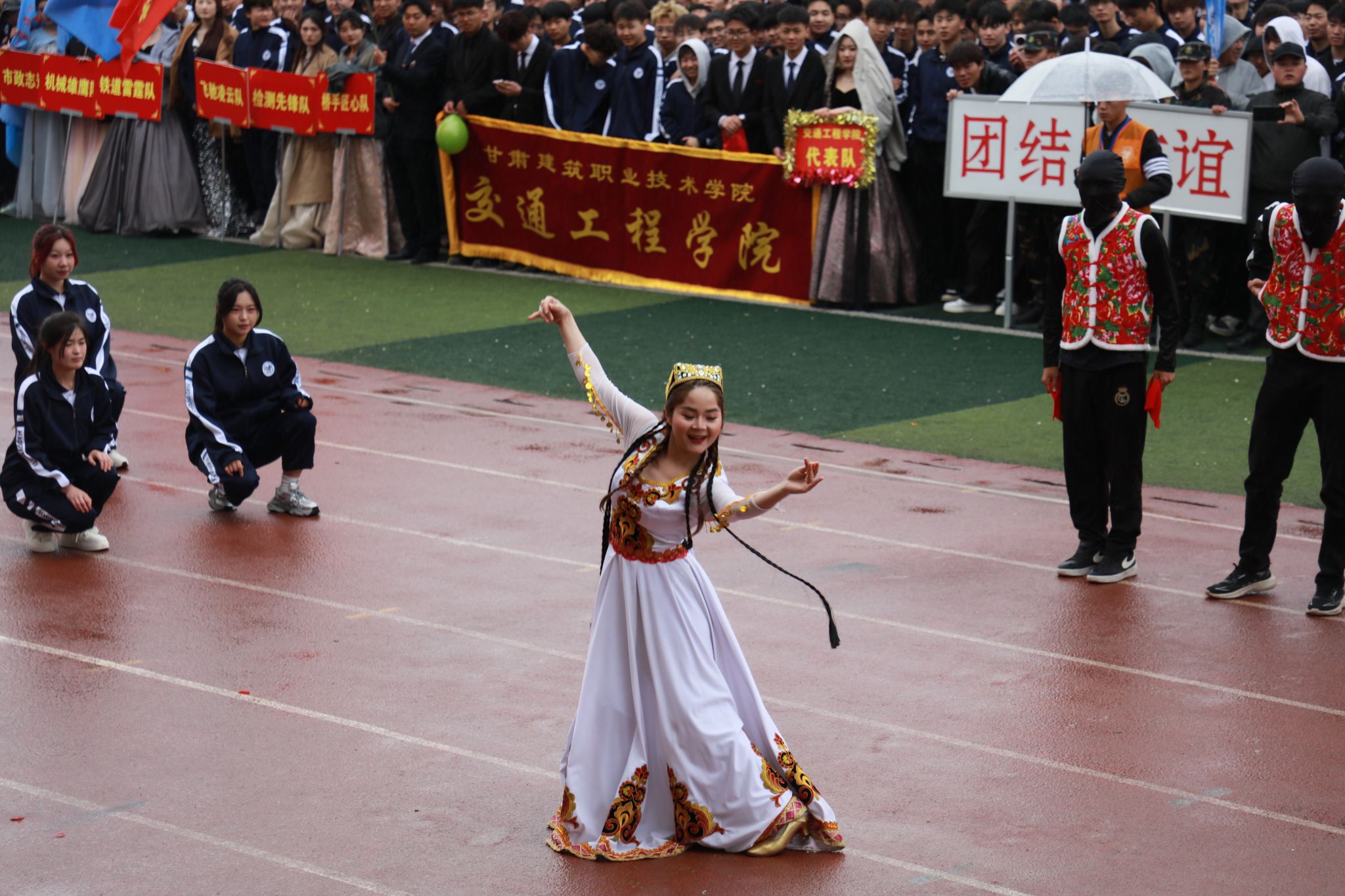 上午8:30分,开幕式开始,彩旗队、退役军人方队、团体操方队、裁判员方队、各二级学院方队依次入场。他们步伐铿锵、口号嘹亮,展现了建院师生朝气蓬勃的精神风貌。入场表演精彩纷呈,现场掌声雷动,气氛热烈。随后王娟丽宣布甘肃建筑职业技术学院第三十一届田径运动会开幕。
