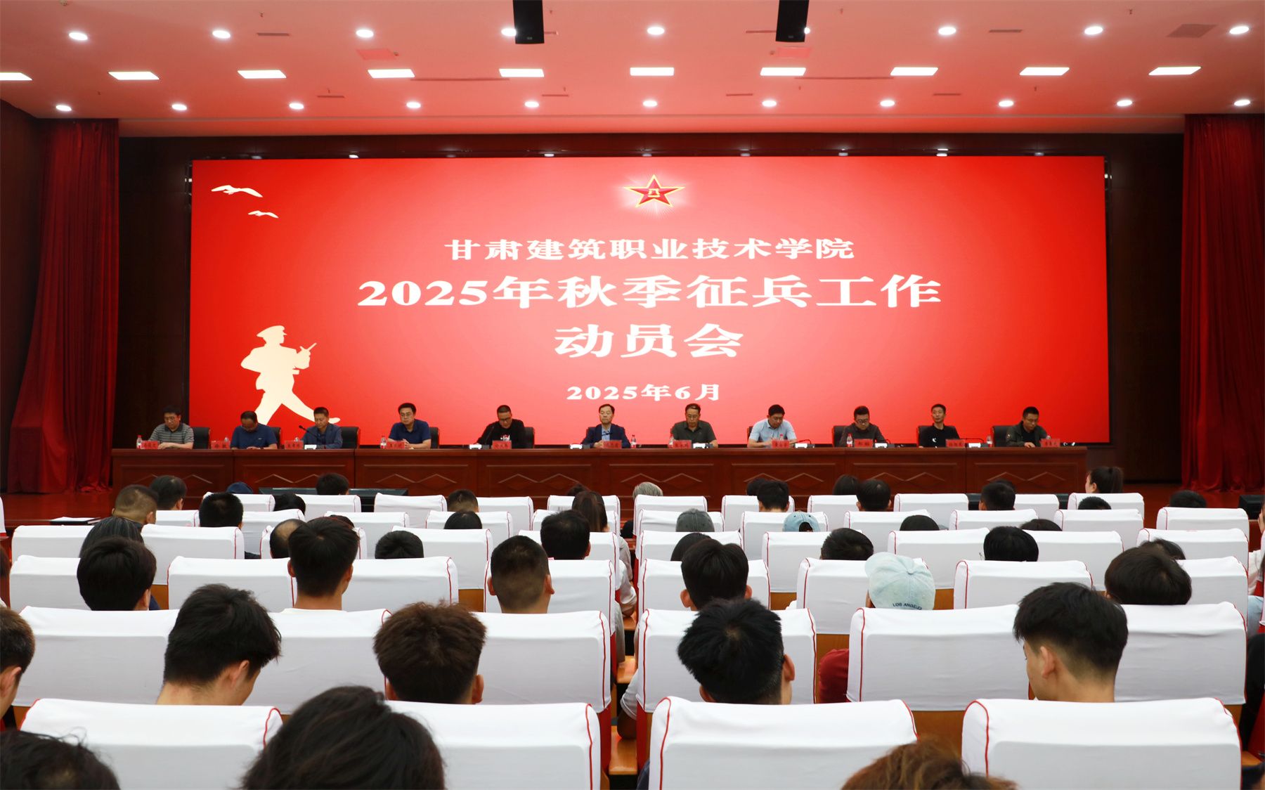 大会在庄严的国歌声中拉开帷幕,许庆兵宣读了《甘肃建筑职业技术学院关于做好2025年大学生应征入伍工作的通知》,通报了2025年上半年学校征兵情况。