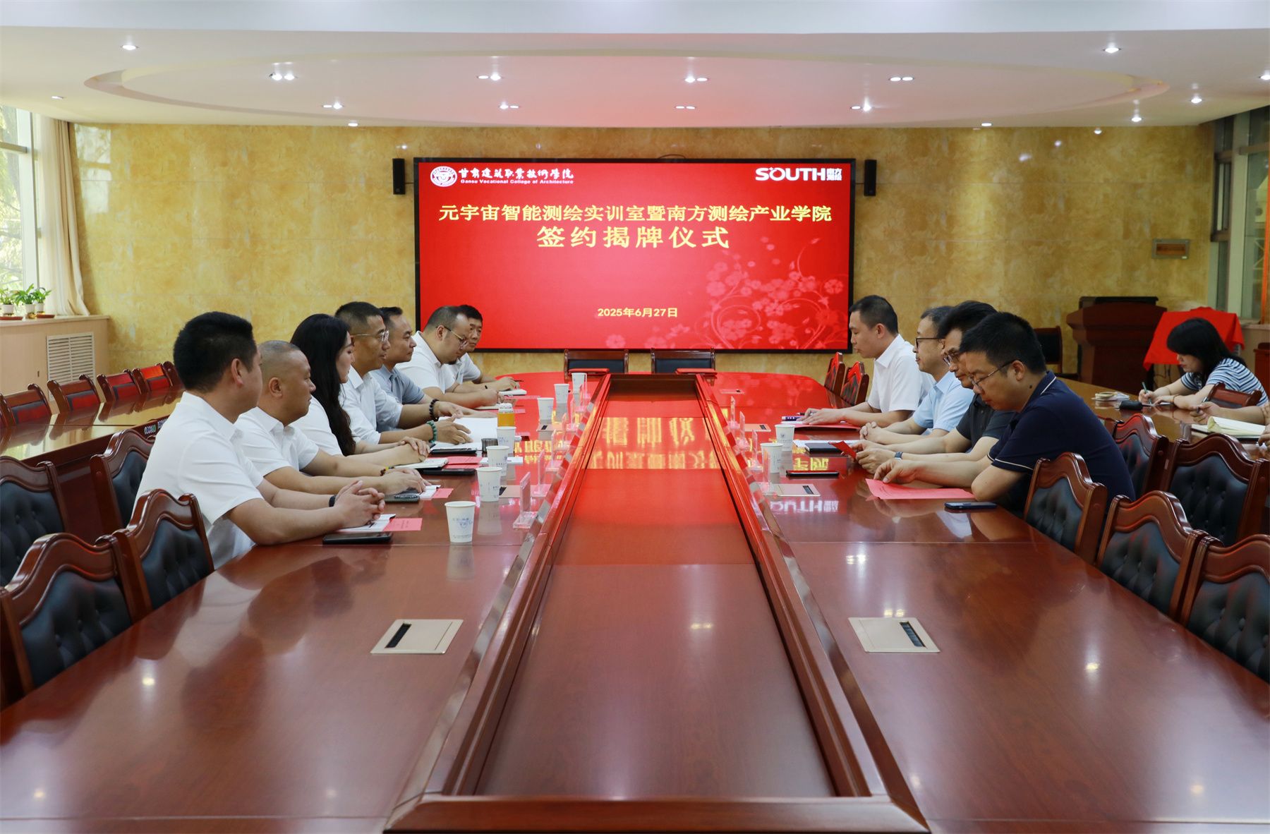 6月27日,在学校2楼新会议室举行了元宇宙智能测绘实训室暨南方测绘产业学院签约揭牌仪式。广州南方测绘科技股份有限公司副总裁、教育事业部总经理、教育部高等学校测绘类专业教学指导委员会委员、全国测绘地理信息职业教育教学指导委员会委员郭宝宇,学校党委副书记、校长党星海,学校党委委员、副校长李维敦,测绘地理信息学院院长刘攀、副院长周美川以及测绘地理信息学院教师代表参会。会议由刘攀主持。
