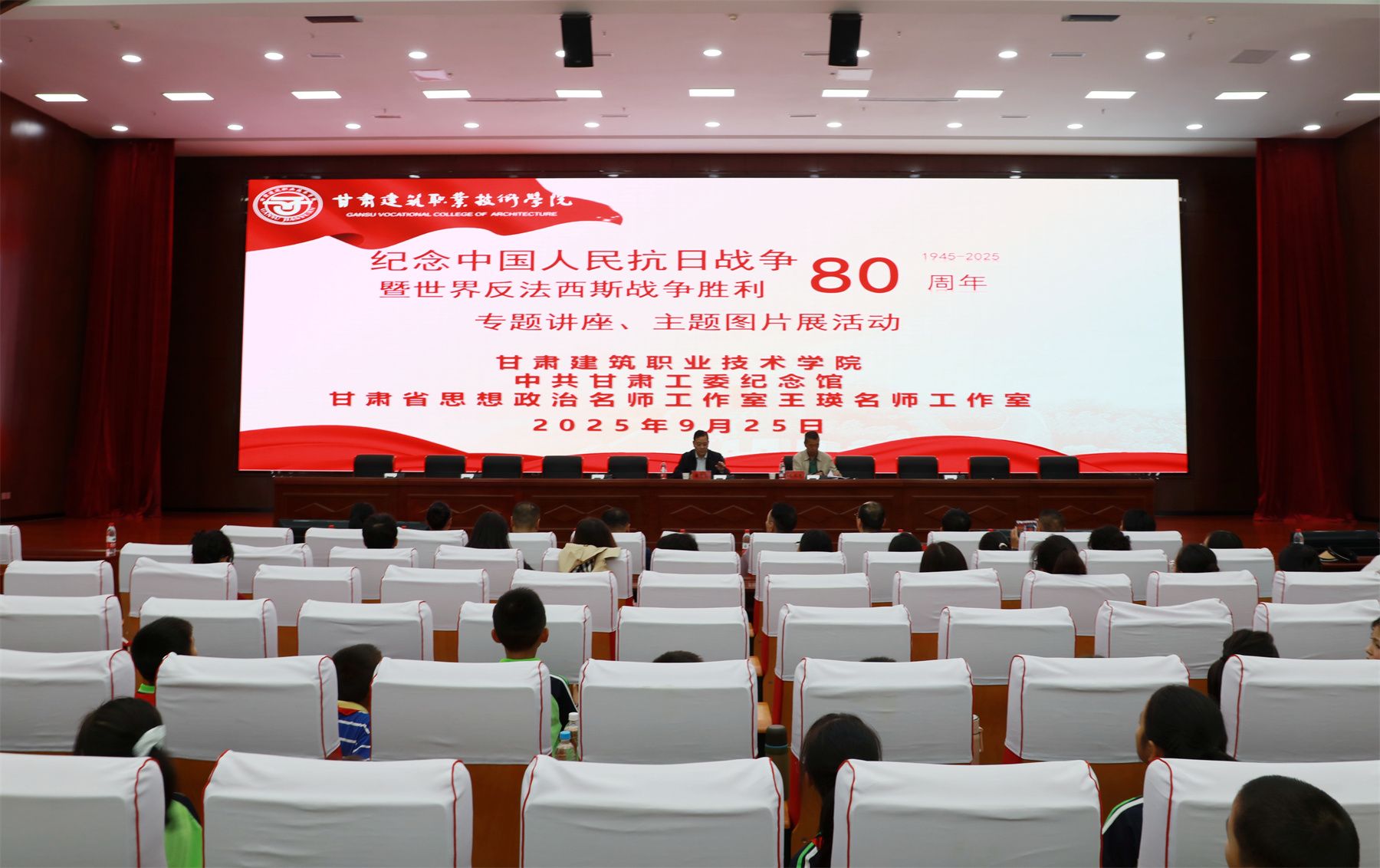 为深入学习习近平总书记在纪念中国人民抗日战争暨世界反法西斯战争胜利80周年大会的重要讲话精神,充分发挥思政课“立德树人”作用,扎实推进大中小学思政课一体化改革创新,打造“大思政课”品牌,9月25日下午,由我校马克思主义学院、甘肃省思政课王瑛名师工作室主办的“纪念中国人民抗日战争暨世界反法西斯战争胜利80周年” 专题讲座与主题图片展活动在学院多功能厅、文化广场举行。原八路军兰州办事处纪念馆馆长、兰州西路军研究会会长朱永光教授,甘肃建筑职业技术学院党委委员、副校长锁冠侠,甘肃工委纪念馆讲解员王素文、孟宪桂,兰州市第八十三中学副校长朱海军,晏家坪第二小学党支部副书记田海龙及我校相关部门负责人、学生代表参加了此次活动。活动由马克思主义学院院长王瑛主持。