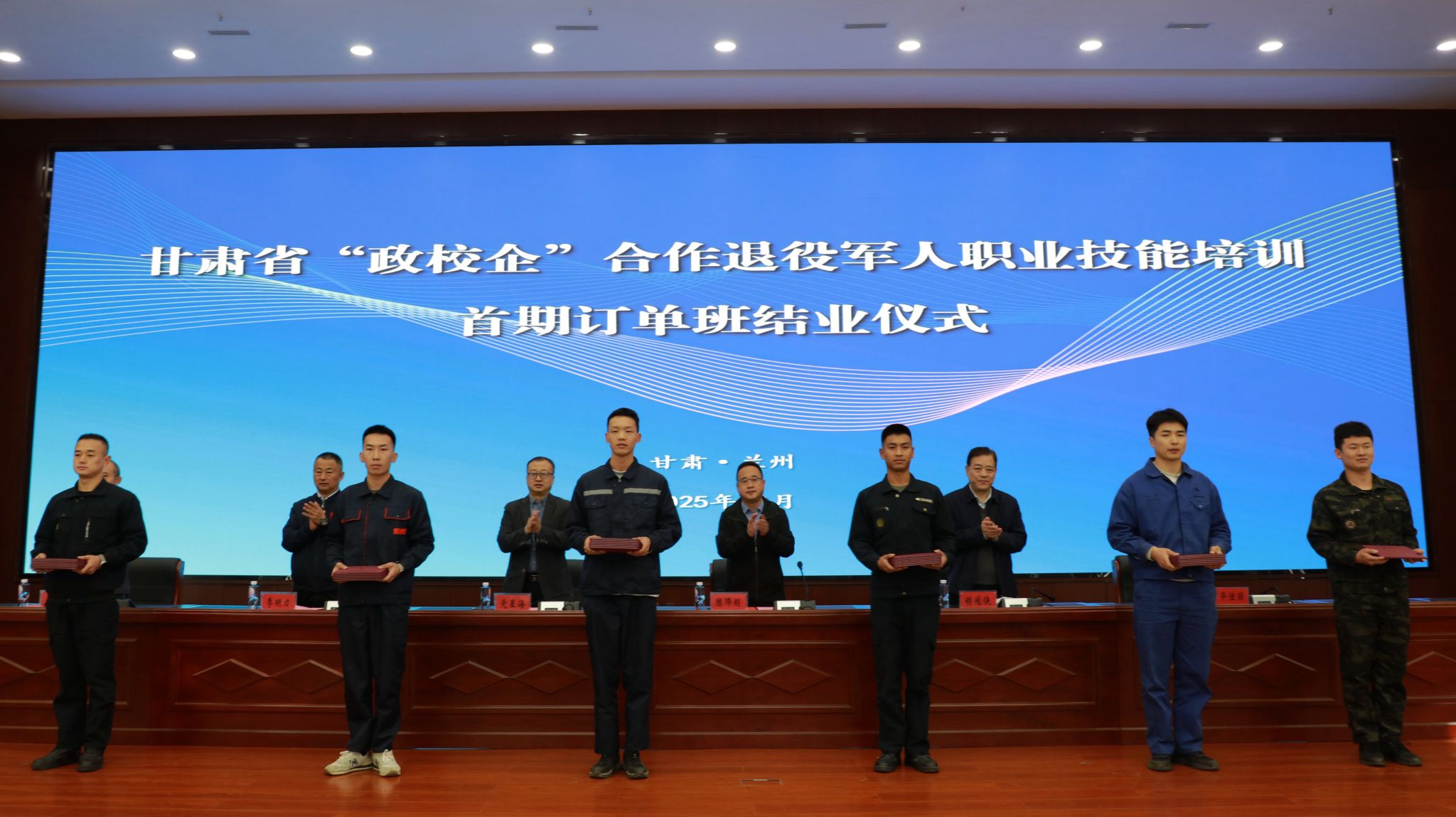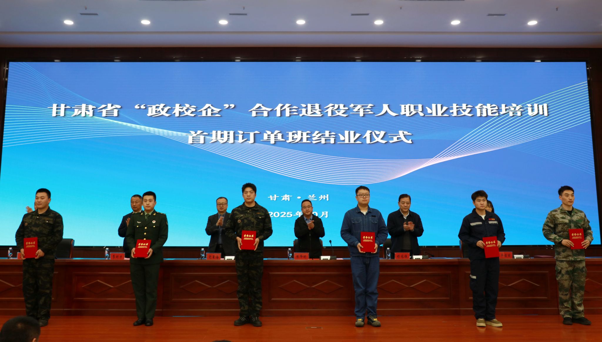 10月13日,甘肃省“政校企”合作退役军人职业技能培训首期订单班结业典礼在我校举行。我校党委副书记、校长党星海,党委委员、副校长锁冠侠,甘肃省退役军人事务厅就创处处长陈降明,中核五公司甘肃项目部党委副书记、项目行政经理季明力及相关负责人,参训学员参加了结业仪式。省退役军人事务厅就业创业处一级调研员温玉林主持仪式。
