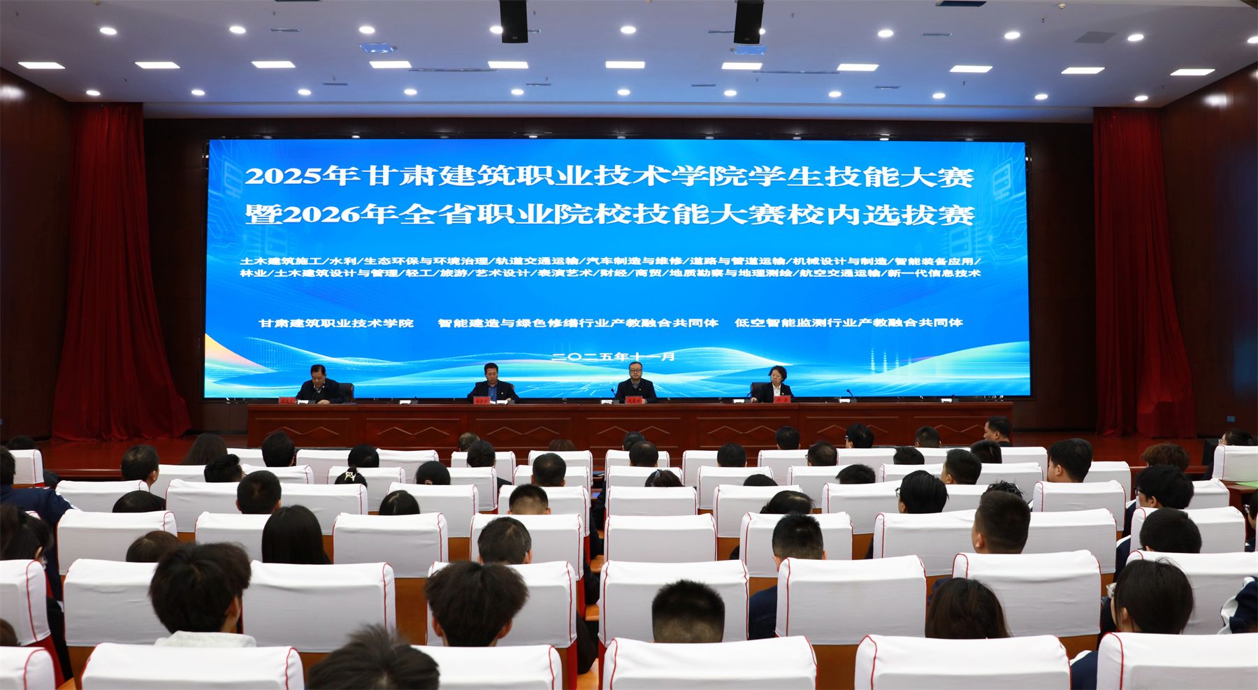 为进一步贯彻落实《国家职业教育改革实施方案》《2025年世界职业院校技能大赛实施方案》等文件精神,坚持“以赛促教、以赛促学、以赛促改”,展示学校技能教学成果,推进“三教”改革,11月13日,2025年甘肃建筑职业技术学院学生技能大赛暨2026年全省职业院校技能大赛校内选拔赛开赛,学校党委副书记、校长党星海,党委副书记许洁,党委委员、副校长锁冠侠,党委委员、纪委书记、监察专员杜彦斌,以及大赛组委会成员、各赛道裁判及参赛选手代表参加开幕式,锁冠侠主持开幕式。