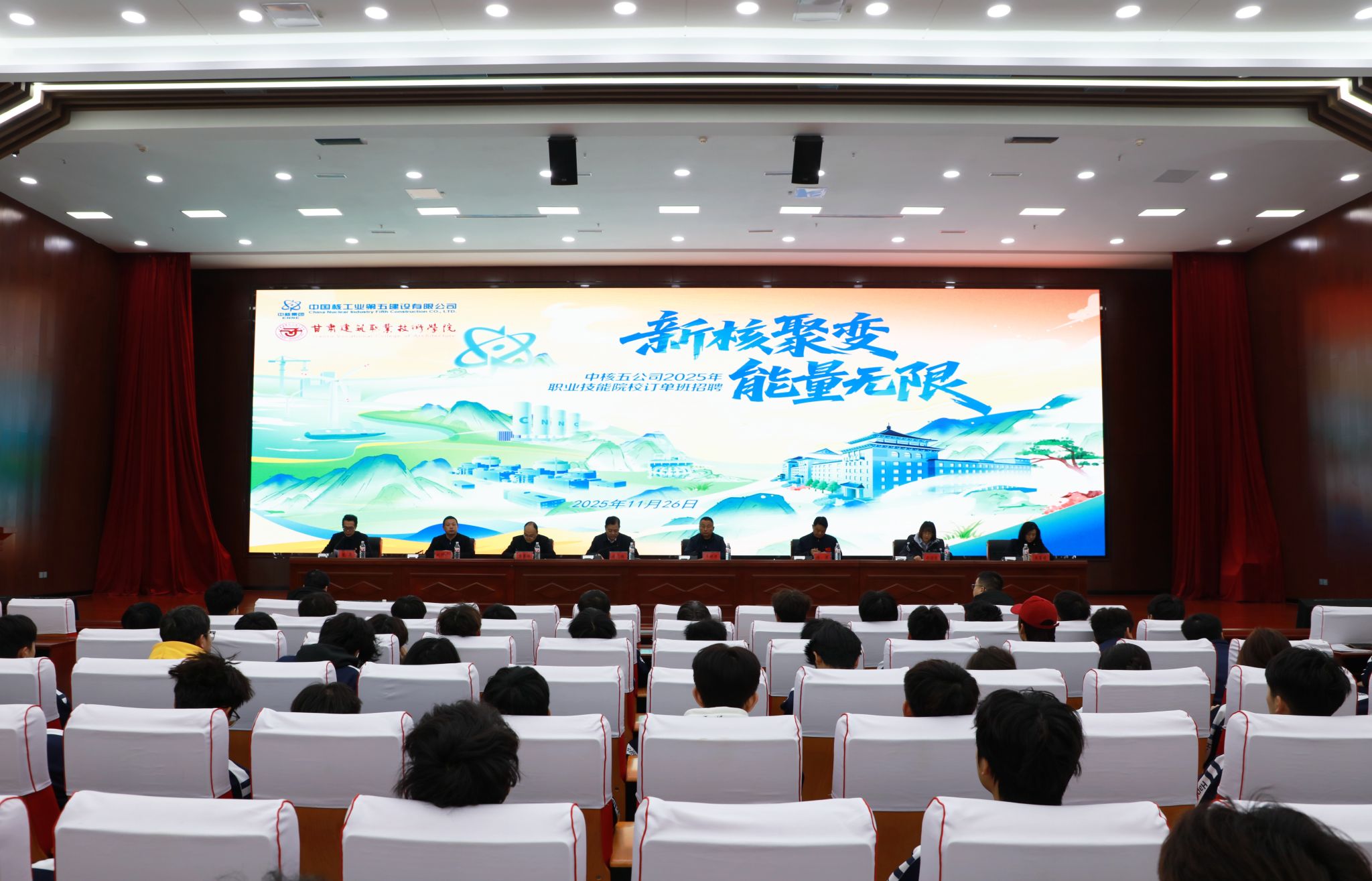 近日,我校2025级中核五公司智能焊接技术专业订单班宣讲及组班大会在多功能报告厅举行。学校党委委员、副校长锁冠侠,中核五公司甘肃项目部经理季明力,中国核建首席技能专家、全国技术能手陈军等,学校各相关部门、二级学院负责人以及500余名师生代表参加。智能制造学院党总支书记王亮主持大会。
