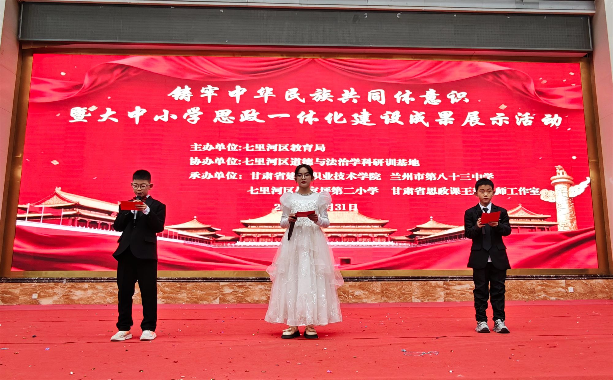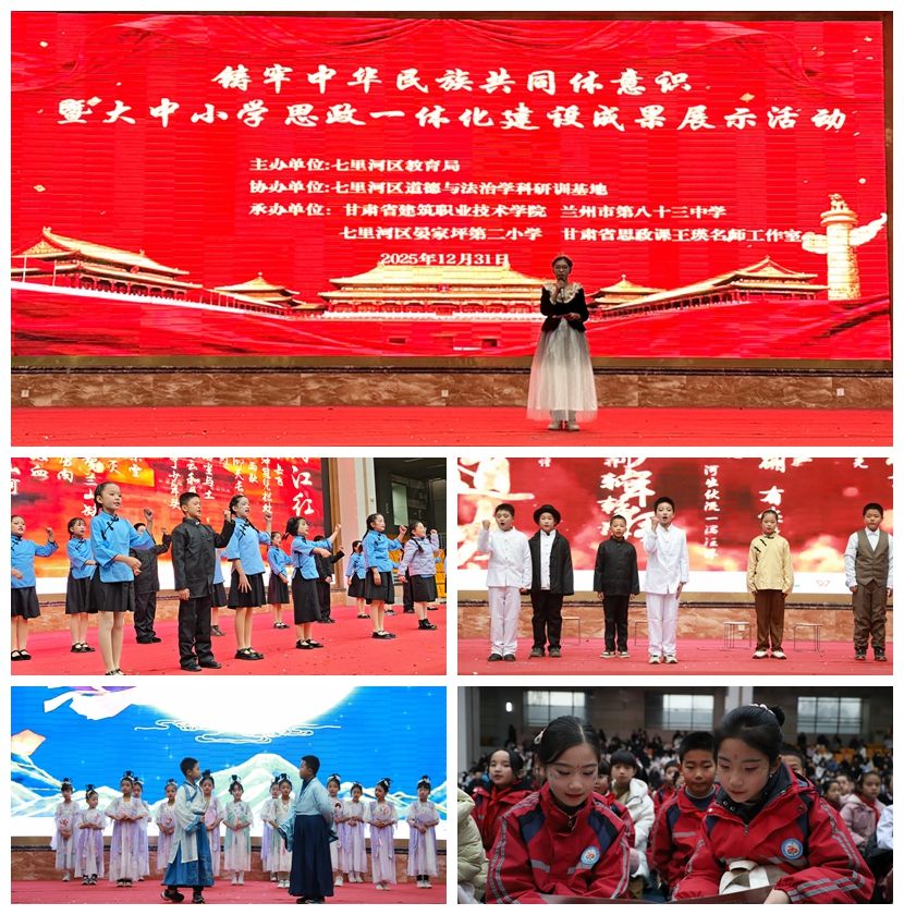 为落实立德树人根本任务,深入学习贯彻党的二十届四中全会精神,推进大中小学思政教育内容衔接、方法创新与机制协同,构建纵向贯通、横向融通的一体化育人新格局,2025年12月31日上午,“铸牢中华民族共同体意识暨大中小学思政一体化建设成果展示活动”在我校体育馆举行。本次活动由七里河区教育局主办,甘肃建筑职业技术学院、兰州市第八十三中学、七里河区晏家坪第二小学、甘肃省思政课王瑛名师工作室联合承办,工作室骨干教师、优秀大学生担任评委。来自大中小学专家、师生、家长,以及社区代表1500余人参加了活动,共同见证了思政教育一体化建设的阶段性成果。