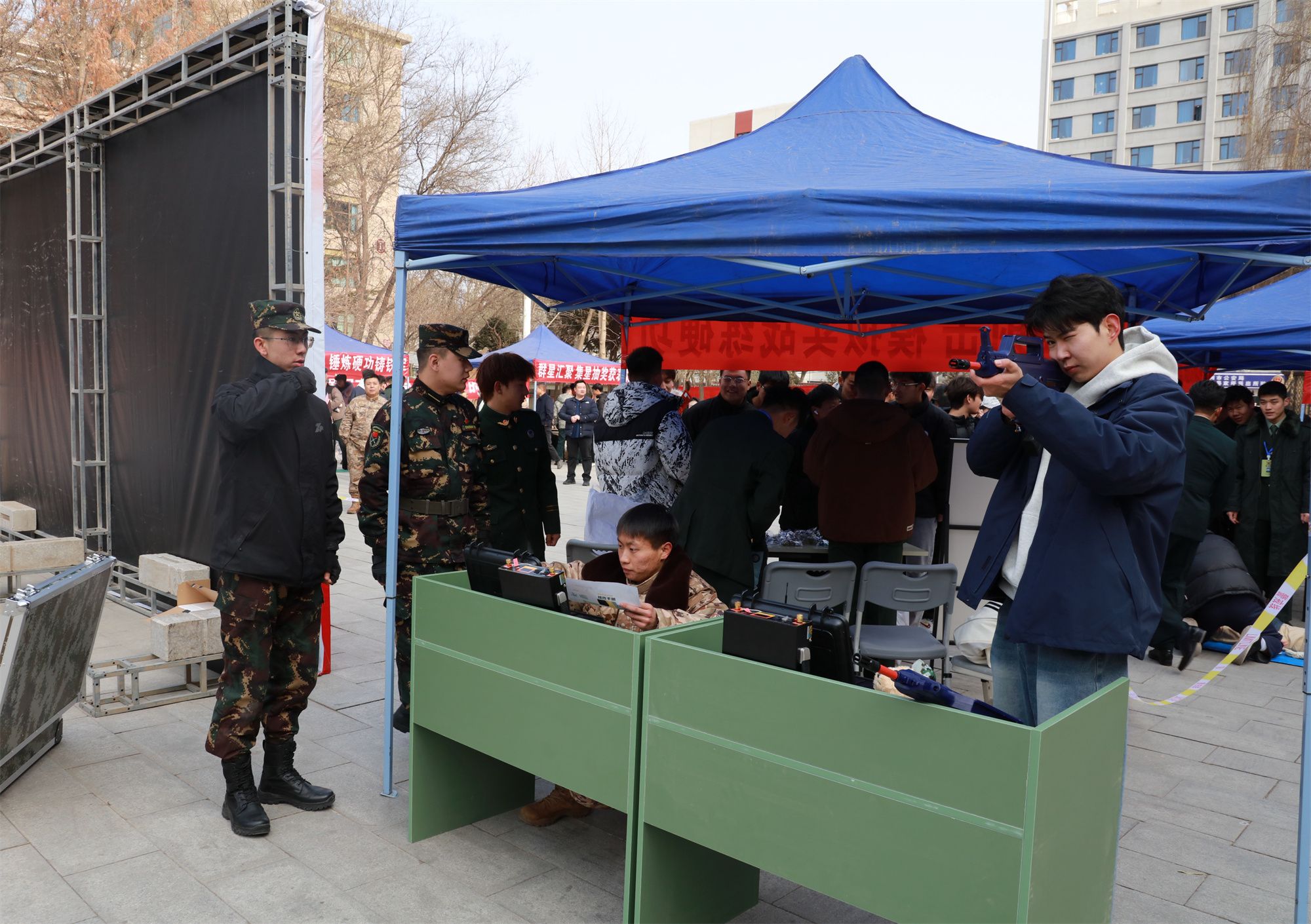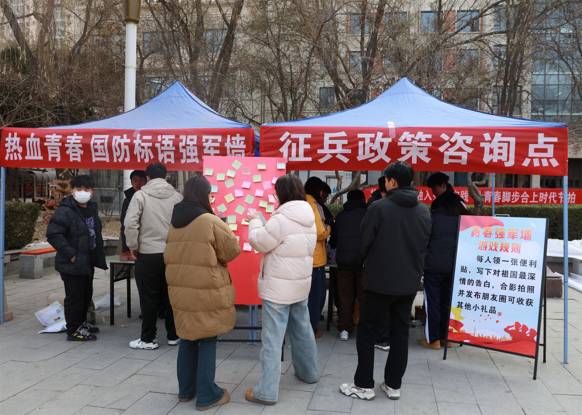 会后,开展了征兵宣传拓展活动,在学校文化广场设置了六个融合军旅特色与趣味挑战的互动游戏环节,通过参与模拟射击、战场救护、体能挑战等游戏,让大家直观感受了军事技能的魅力与军营文化的内涵。活动吸引了同学们踊跃参与,现场气氛热烈。