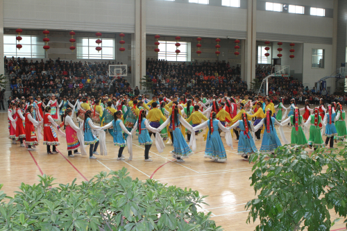 比赛中,同学们身着盛装,以积极向上的态度把历经几周排练的精彩节目展现给现场观众,多次赢得观众的热烈掌声。在比赛间隙,学院飞龙武术协会的同学表演了精彩的武术,来自学院各部门的20名女教师也参与表演了锅庄舞,为本次比赛更增添了喜庆的气氛。