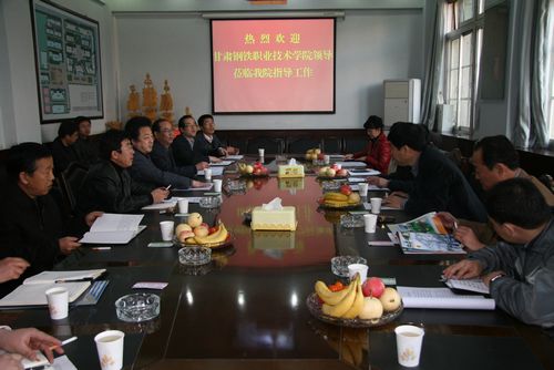 甘肃钢铁职业技术学院院长韩炳刚一行七人来我院考察交流 日期:2011-04-01 来源: 2010年3月30日,甘肃钢铁职业技术学院院长韩炳刚、副院长童占一以及院长助理,教学、后勤、校办企业负责人一行7人来访我院并做考察交流。我院党委书记马江、院长田树涛、副院长李社生、副院长孟兰生、院长助理刘亚龙以及教务处、招生就业处、后勤处负责人参加交流座谈会。 座谈会上,院长田树涛首先致欢迎辞,就学院发展、办学情况做了简要介绍。随后,双方各处室负责人就教学、招生就业、后勤相关工作做了对口交流。 最后,韩炳刚院长一行在院领导的陪同下,考察了我院校园基础设施建设及宿舍、食堂管理。