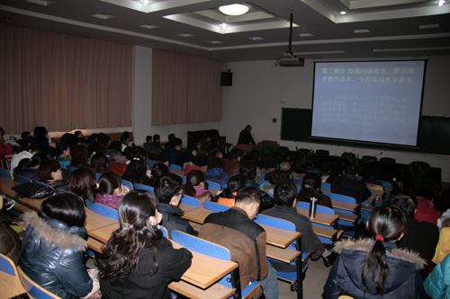 2009年1月14日上午,我院在二号教学楼阶二教室召开建院2008年度工作总结大会。会议总结了2008年学院的各项工作,重点回顾了学院“迎评促建”工作所取得的成绩,认真分析了我们工作中存在的问题和不足,分析了我院2009年工作面临的形势,并就09年工作做出了全面布署。学院全体领导班子出席会议,全院近三百名教职员工参加了会议。王娟丽副院长主持会议。