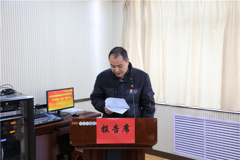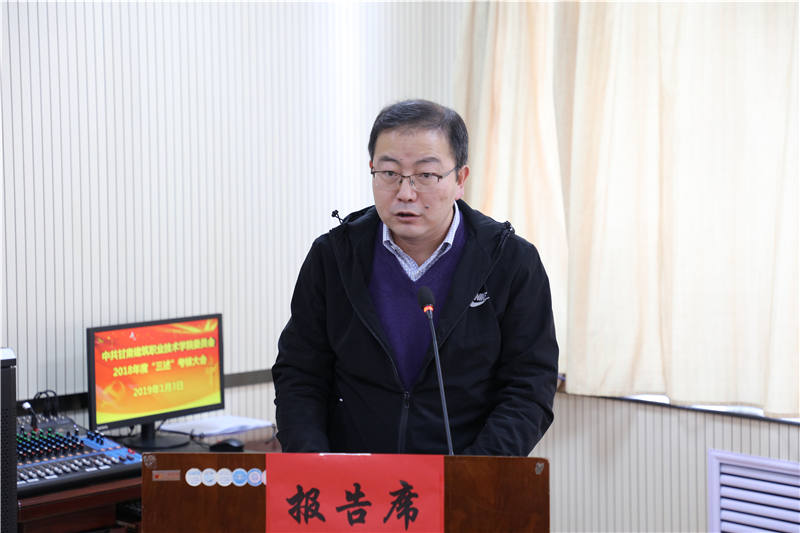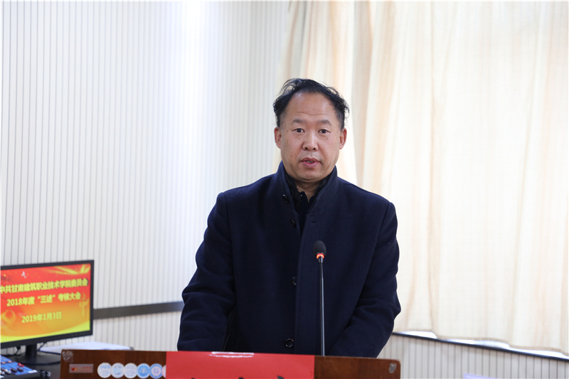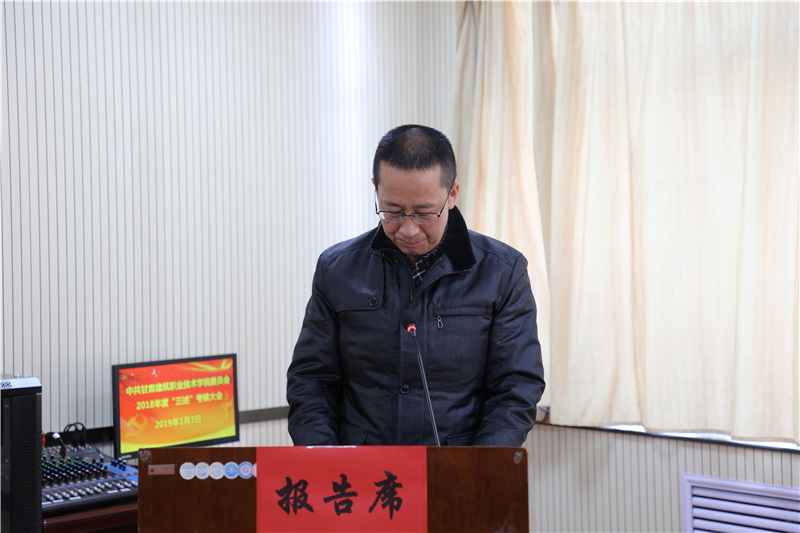 1月3日,中共甘肃建筑职业技术学院委员会召开了2018年“三述”考核大会。10位中层干部在会上做了“三述”报告,学院党委副书记、纪委书记王继伟主持大会,副院长刘亚龙及中层干部和部分教职工代表参加了考核大会。