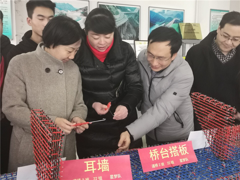 在大赛决赛开幕式上,甘肃顺达路桥建设有限公司副总经理马选业寄语同学们,要夯实理论知识基础上提高岗位能力,指出了本次大赛模块设置紧贴施工一线岗位能力,肯定了学院教学质量,同时表示甘肃顺达路桥建设有限公司会为交通系学生提供发展平台;教务处处长李君宏对本次大赛参与学生的广度和比赛深度表示赞扬,对本次校企合作、工学结合的模式表示肯定;交通系主任王荣介绍大赛筹备及比赛情况。决赛期间特邀学校招就处、学生处、创新创业处领导、老师参观模型展。