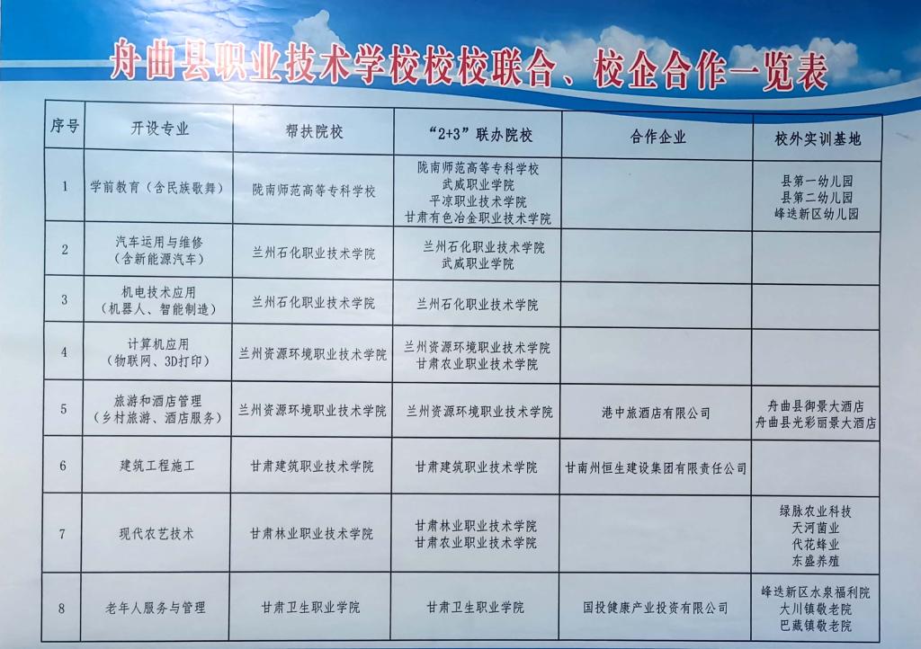 为响应国家大力发展职业教育,服务地方经济的号召,舟曲县职业技术学校2019年新开设建筑工程施工等8个新专业,分别由甘肃建筑职业技术学院、兰州石化职业技术学院、兰州资源环境职业技术学院、甘肃林业职业技术学院、甘肃卫生职业学院和陇南师范高等专科学校,六所学院帮扶建设。根据教育厅的统一安排,建筑工程施工专业由我院帮扶建设。