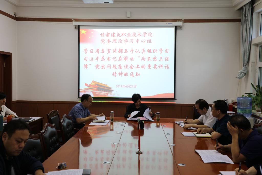 6月24日,甘肃建院党委理论中心组学习了中共甘肃省委教育工作委员会转发中共甘肃省委宣传部《关于认真组织学习习近平总书记在解决“两不愁三保障”突出问题座谈会上的重要讲话精神的通知》和《“不忘初心、牢记使命”主题教育如何开展,习近平总书记这样说》的相关内容。学院党委委员、党委书记、院长王娟丽同志及中心组成员参加了学习。党委宣传统战部部长李春雨主持学习。