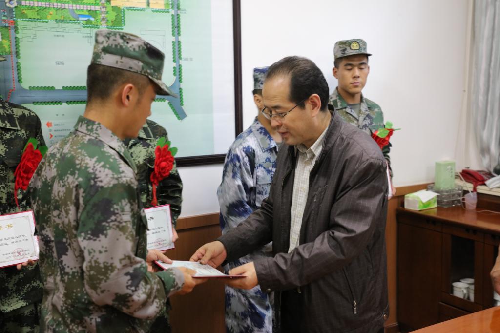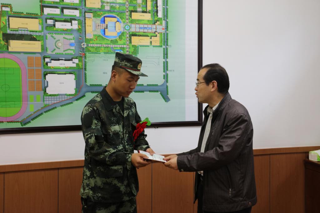 学院党委委员、副院长李君宏为38名新兵代表颁发了 “参军报国优秀大学生”荣誉证书,并代表学院向新兵代表发放了纪念品,表达了学校的祝贺和感谢。
