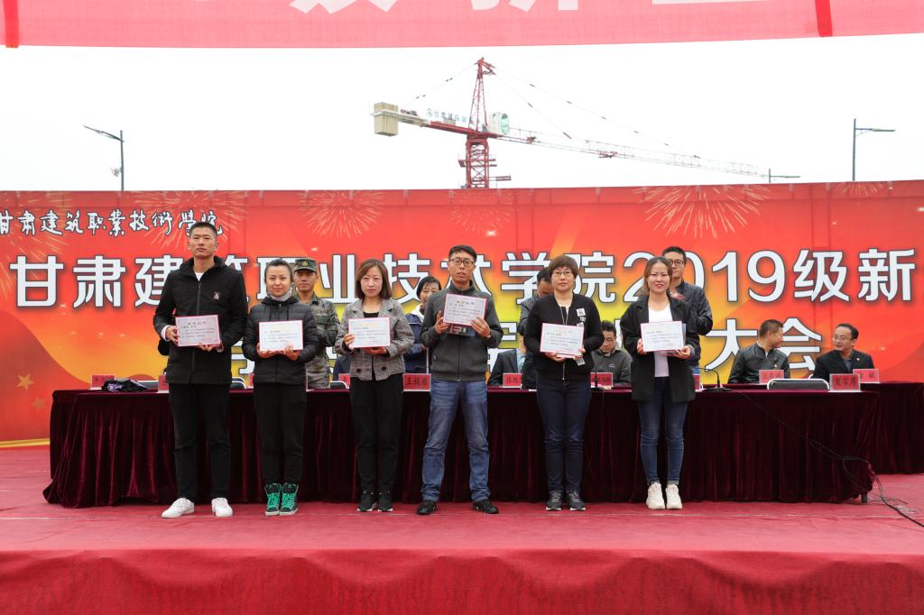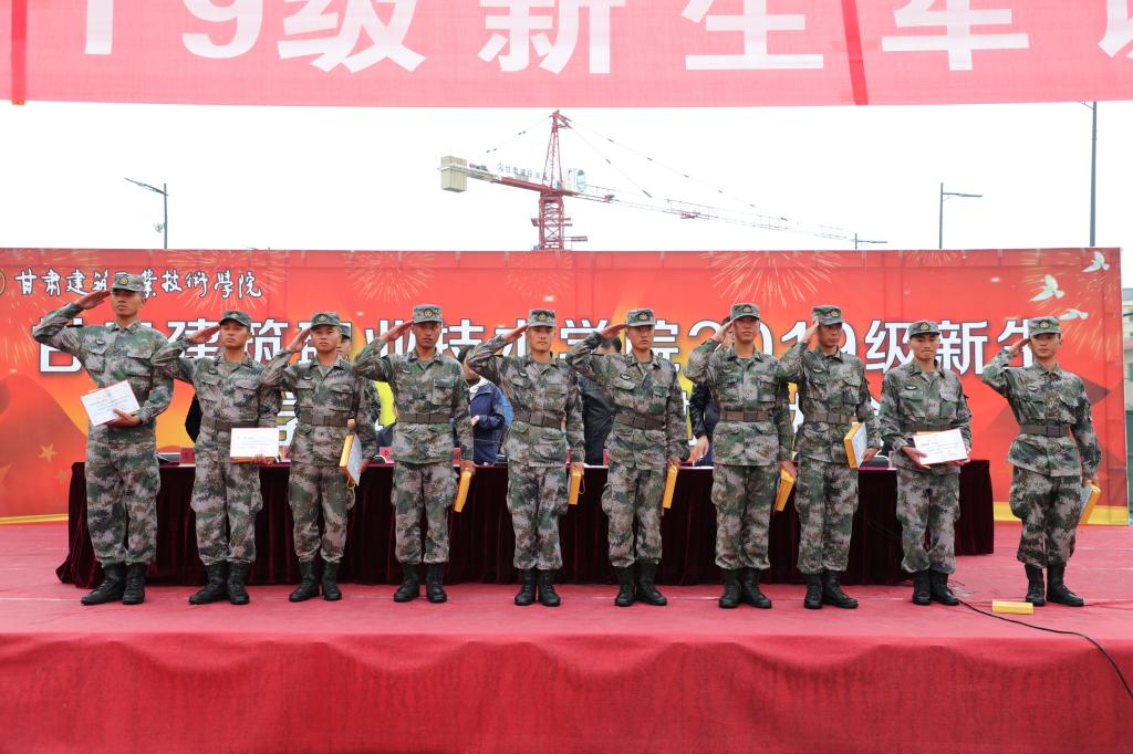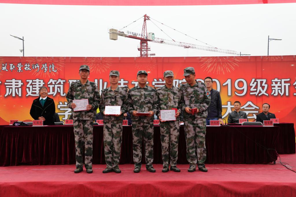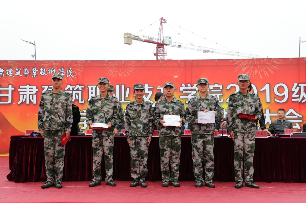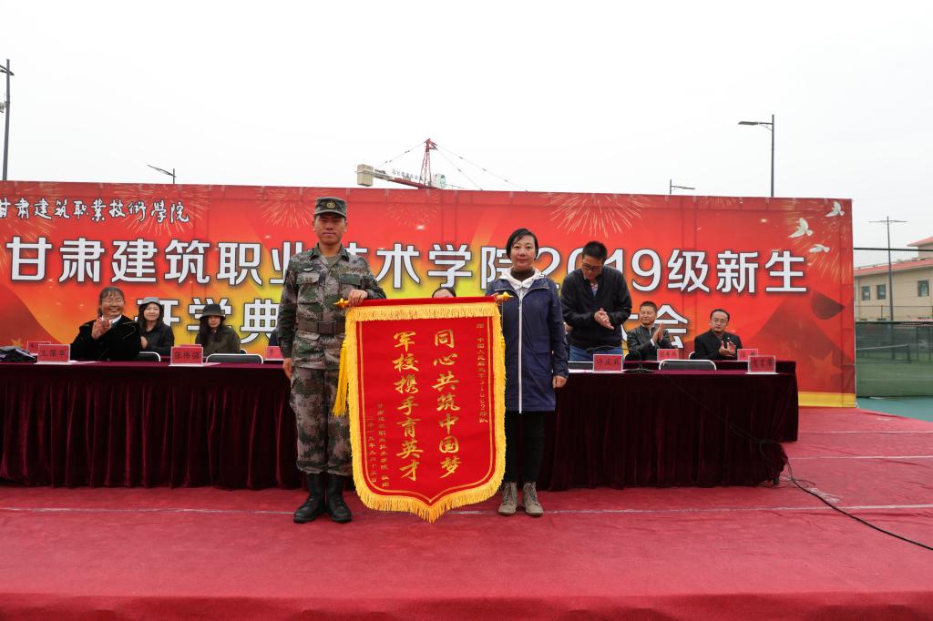 表演结束后,学院学生工作处副处长许庆兵宣读了《甘肃建筑职业技术学院关于表彰2019级学生军训先进集体及先进个人的决定》,出席会议的领导为获奖集体和个人颁发了荣誉证书与奖品,学院党委书记、院长王娟丽代表学院向驻临夏防空第76旅赠送了“同心共筑中国梦,军校携手育英才”的锦旗。 随后,2019级参训学生代表姜浩栋作了热情洋溢的发言,分享了自己的军训中的感受与收获,号召同学们在未来的学习生活中保持军训中养成的良好习惯,争做优秀建院人。