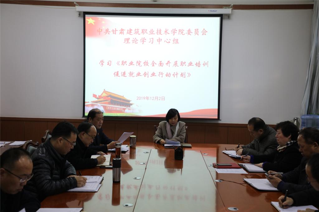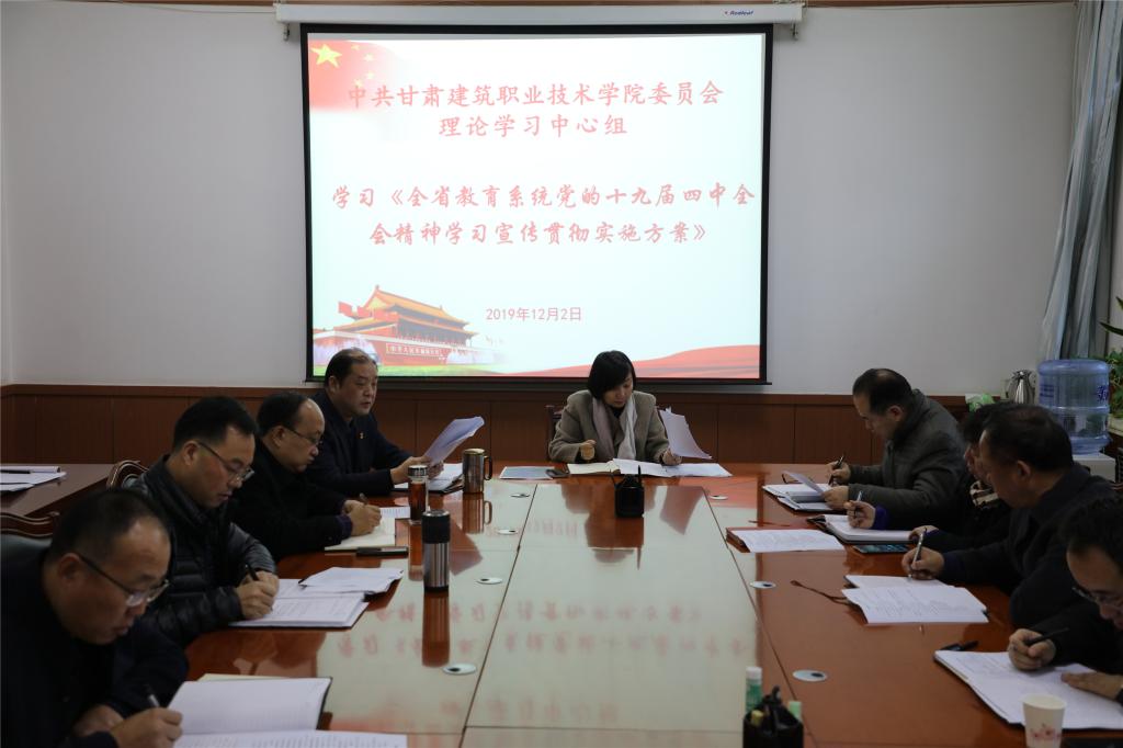 12月2日,甘肃建筑职业技术学院党委理论学习中心组集中学习了教育部办公厅等十四部门关于印发《职业院校全面开展职业培训 促进就业创业行动计划》的通知;以及中共甘肃省委教育工作委员会 中共甘肃省教育厅党组关于印发《全省教育系统党的十九届四中全会精神学习宣传贯彻实施方案》的通知。学院党委书记、院长王娟丽及中心组成员参加了学习,党委副书记王继伟主持学习。