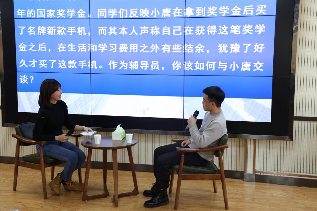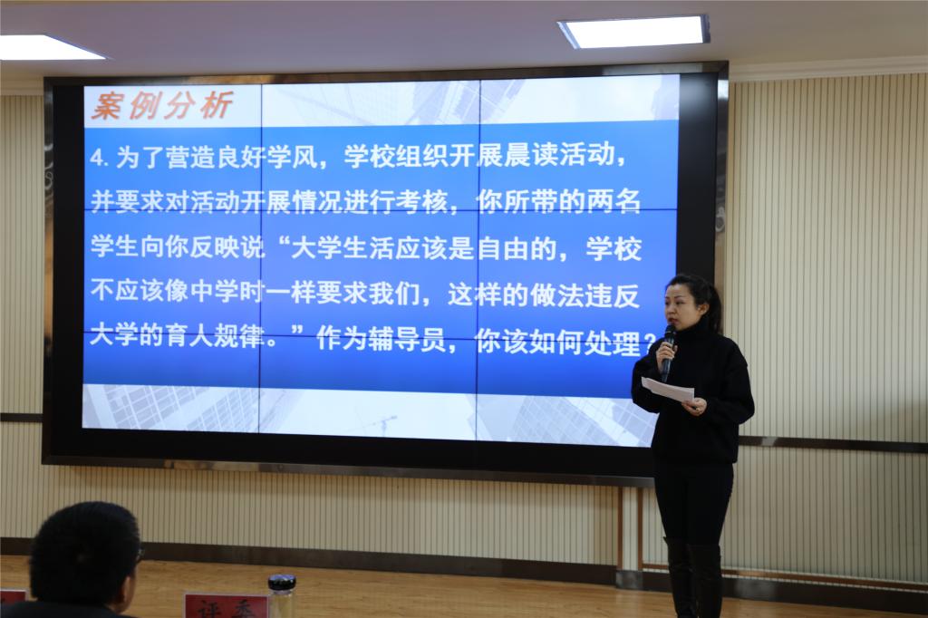 大赛分为两个阶段四个环节,第一阶段项目由笔试(包括基础知识测试、博文写作)和案例分析环节组成,第二阶段项目由谈心谈话和理论宣讲环节组成。其中,第一阶段的笔试考察辅导员对相关理论政策及学生管理知识的掌握程度以及理解分析信息和解决问题的能力,案例分析考察辅导员分析问题、思考问题、研判问题、解决问题以及理论学习应用能力。全体一线专职辅导员、学生干事共计30余人参加了第一环节的笔试,成绩前15名的选手晋级案例分析环节比赛;前两个环节总成绩前10名的选手晋级第二阶段的比赛。第二阶段的谈心谈话考察辅导员对相关理论政策、学生特征、学生成长成才规律的了解把握及对问题的解决能力和对学生的教育引导能力,理论宣讲环节注重考察宣讲的政治性、思想性、理论性、政策性、导向性。