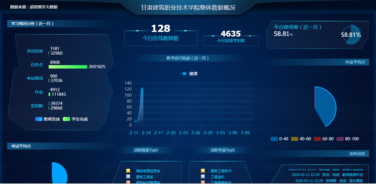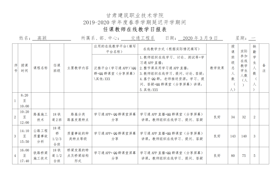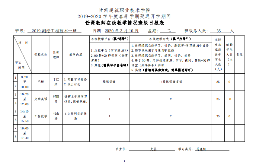 按照《学院2019-2020学年度春季学期延迟开学期间教学组织与实施方案》要求,各系、部、中心认真组织填报任课教师在线教学情况班级日报表、任课教师在线教学日报表,并做好在线教学情况统计、分析工作,形成在线教学日报告制度,及时了解、反馈并改进在线教学及在线教学组织和管理。同时,由教务处协同各系、部、中心及超星公司对在线教学全过程进行跟踪检查,对直播进行抽查,严格执行在线教学及学习纪律,及时掌控全院在线教学情况,做好相关问题跟踪处理,全面保障教学质量。