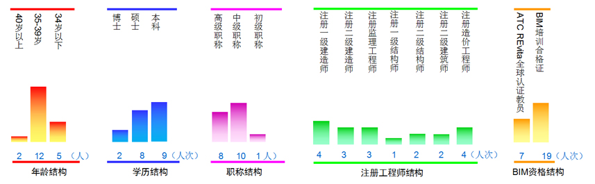 BIM技术中心已建成由十九人组成的技术团队,其中取得AutodeskRevit全球认证教员资格的有7人,其余均取得BIM培训合格证。成员中注册二级建筑师2人,注册一、二级结构工程师2人,注册一、二级建造师5人,注册造价工程师4人,注册监理工程师3人,以及经济师、设备工程师、动画渲染设计师等优秀双师型专业教师组成。