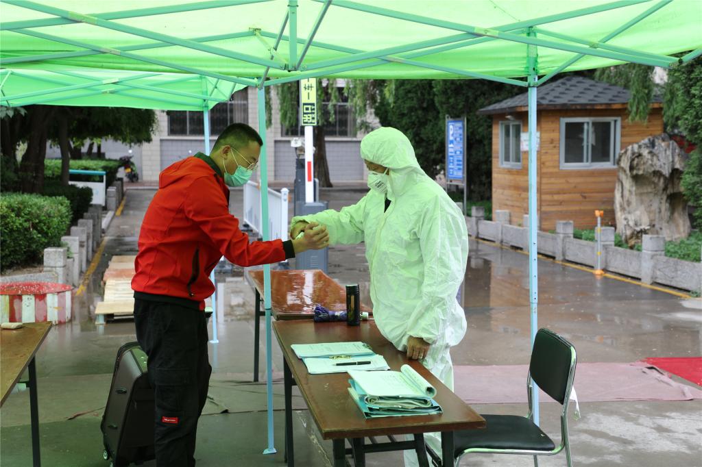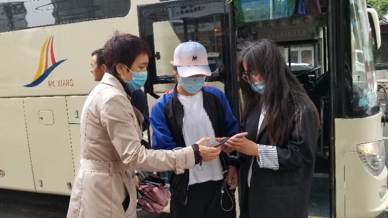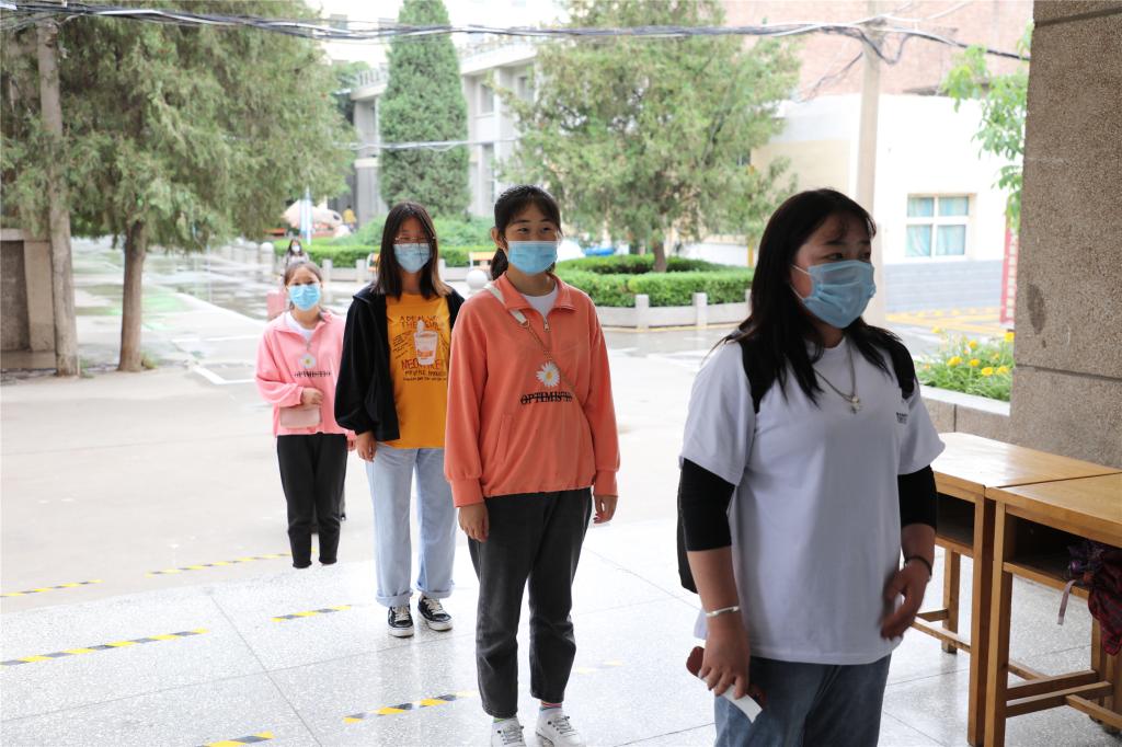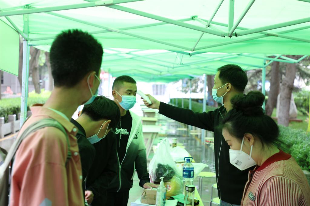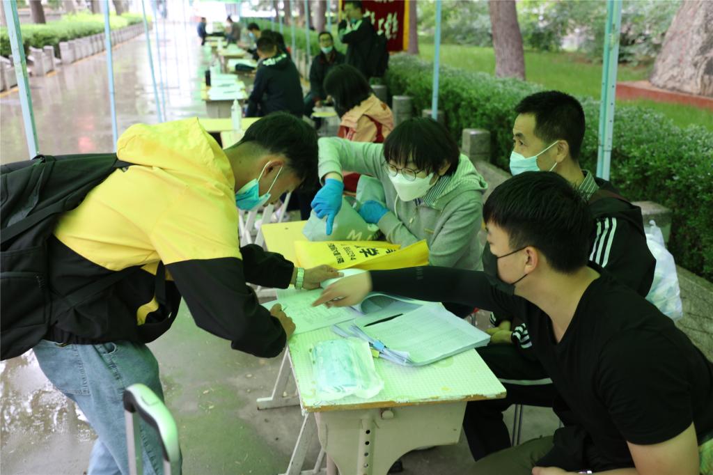 同学你从哪里来?返校健康二维码是否填写?请同学们依次排队,间隔1.5米,这是学院为你们准备的口罩。暖心的举措和问候让同学们一入校就感觉到学院给予的温暖。