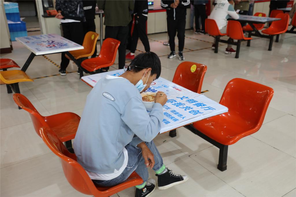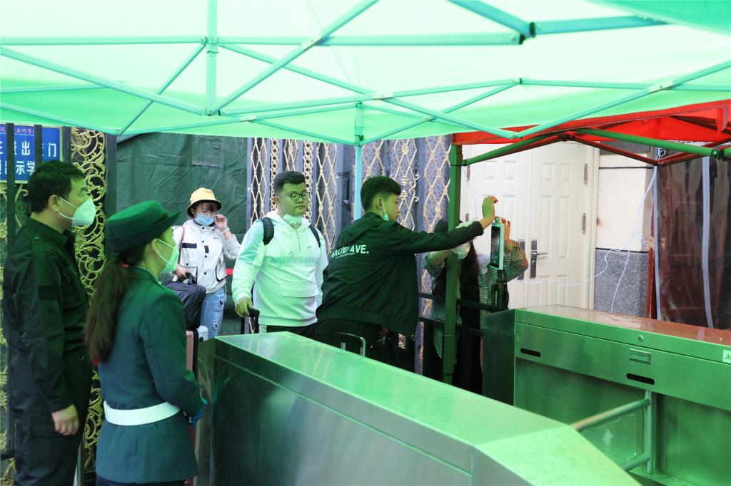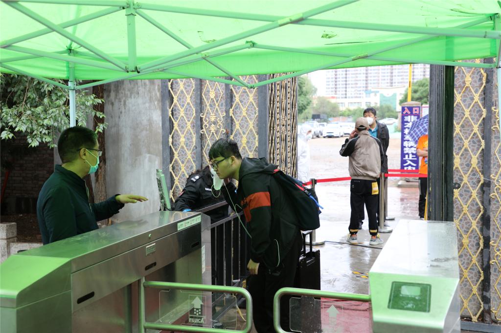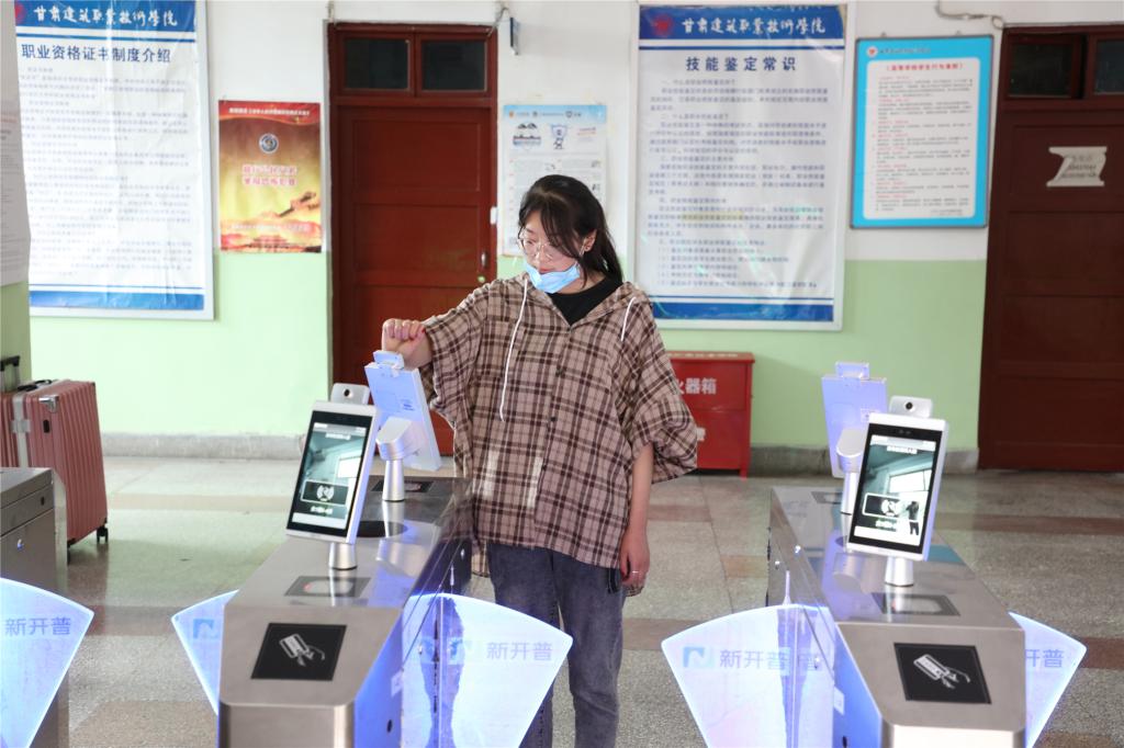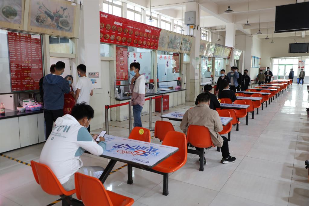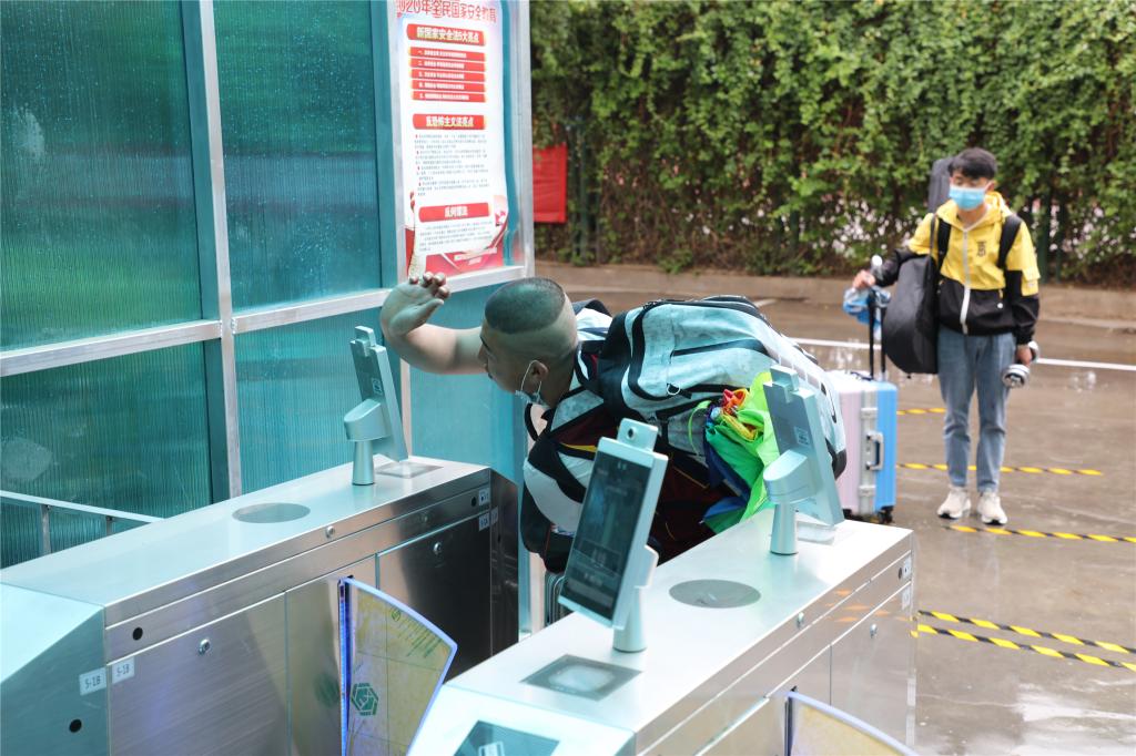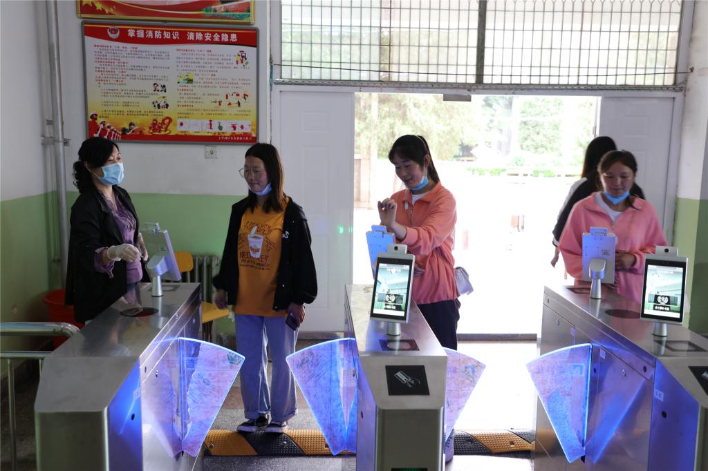 在学院门口,返校的学生扫码、领表、行李消杀,一个环节都不能少且有序进行。在校门入口处和宿舍大门入口处,都置放了人脸识别和测温闸机,对所有进入校园人员进行实时体温监测。在食堂,学生有序间隔1米排队并向用餐,实现“精准防控”,为学校疫情防控工作加固了防线。