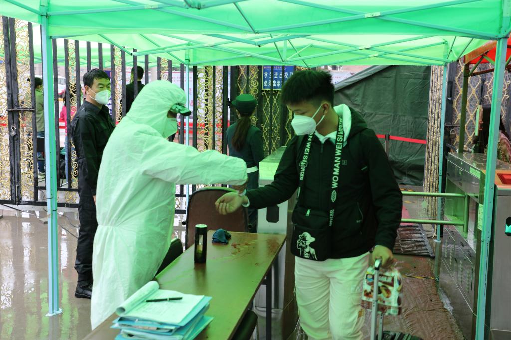“一路上,车站、学校的工作人员对我们进行了体温测量,物品消杀,健康码标记,把危险降到了最低。” 工程造价张磊同学说。“太想念学校了!”齐佳欣说。“再次见到熟悉的老师,真好!”装饰1班贾欢同学说。