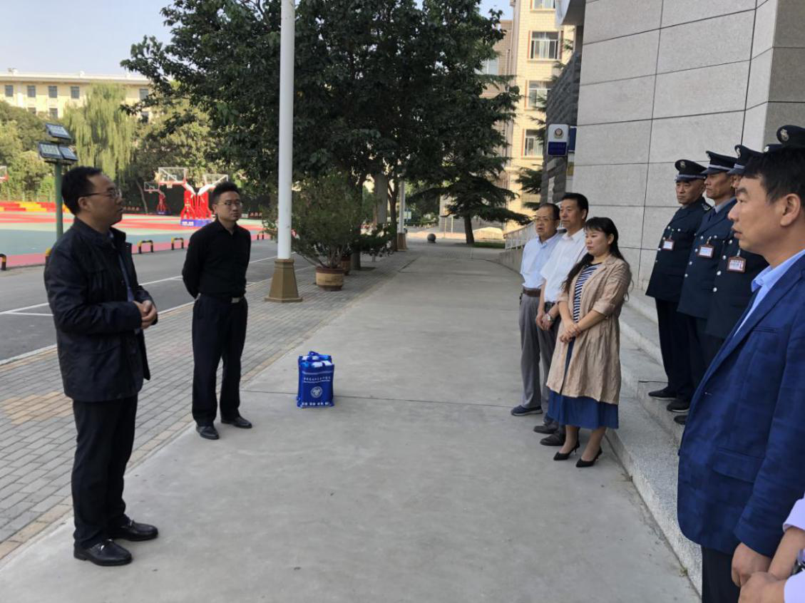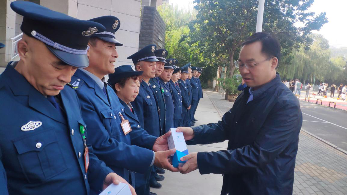 学院领导“教师节”慰问一线保安员 日期:2020-09-10 来源: 9月10日上午,学院党委委员、副院长高忠有慰问了自疫情发生以来一直坚守在工作岗位上的全体保安员。 首先,高忠有同志对保安员前一阶段工作给予了高度评价,对保安员忠于职守,为学院安全作出的贡献表示感谢。并指出,虽然保安员不是专业的教育工作者,但在全员育人的环节中也占据了特殊的地位,也应有自己的使命与担当。在接下来的工作中,希望保安员继续保持和发扬良好的工作作风,继续为学院稳定做出应有贡献。 最后,高忠有同志为全体保安员发放了纪念品,并祝全体保安人员在第36个教师节与全院教职员工同心同乐。