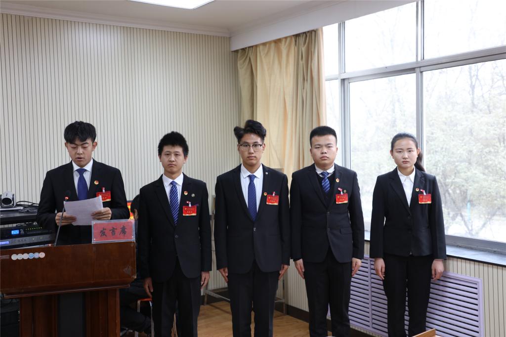 新当选的学生会成员代表宋佛平表态发言时讲到,学院学生会高举习近平新时代中国特色社会主义思想伟大旗帜,全面贯彻落实党的十九大精神、中央群团工作会议精神、全国高校思想政治工作会议精神、全国教育大会精神和习近平总书记关于青年工作的重要论述,按照全国学联二十七大精神的要求,团结带领全校学生紧密围绕在学院党委周围,紧紧围绕学院中心任务,团结拼搏,锐意进取,全面落实学院党委领导、团委指导的整体工作部署,在继承中创新、在探索中前进。学生会将带领各级学生做好模范带头作用,时刻以身作则,处处树立榜样,秉公办理各类事务,善于听取不同意见,完善自己,促进工作,严于律己,努力引导全体同学全面发展。全体学生会干部一定会团结互助、积极进取,充分发挥学生会的作用和影响力。