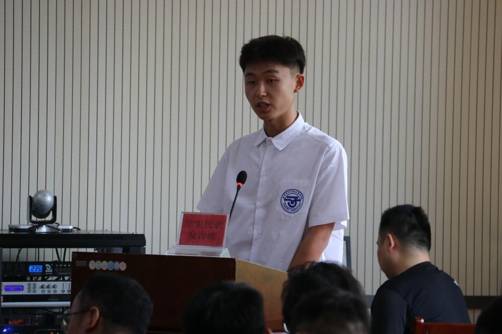 优秀退役复学大学生代表2020级建筑工程技术5班孙一凡同学用“甘做胡杨淡看大漠孤烟”、“砥砺初心不坠凌云之志”、“继续前进续写无悔青春”三句话分享了自己携笔从戎,扎根大漠,建功立业的从军经历及成长之路;随后,2021年秋季应征报名大学生代表2020级计算机5班戴炜宸同学向全院青年学子发出倡议,倡议大家响应国家号召、走进军营、携笔从戎、建功立业。