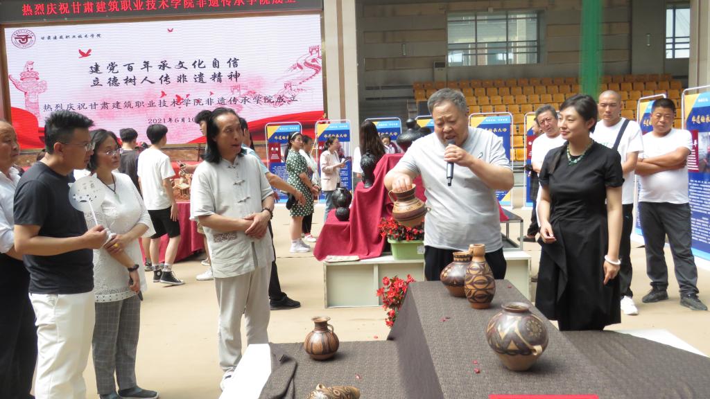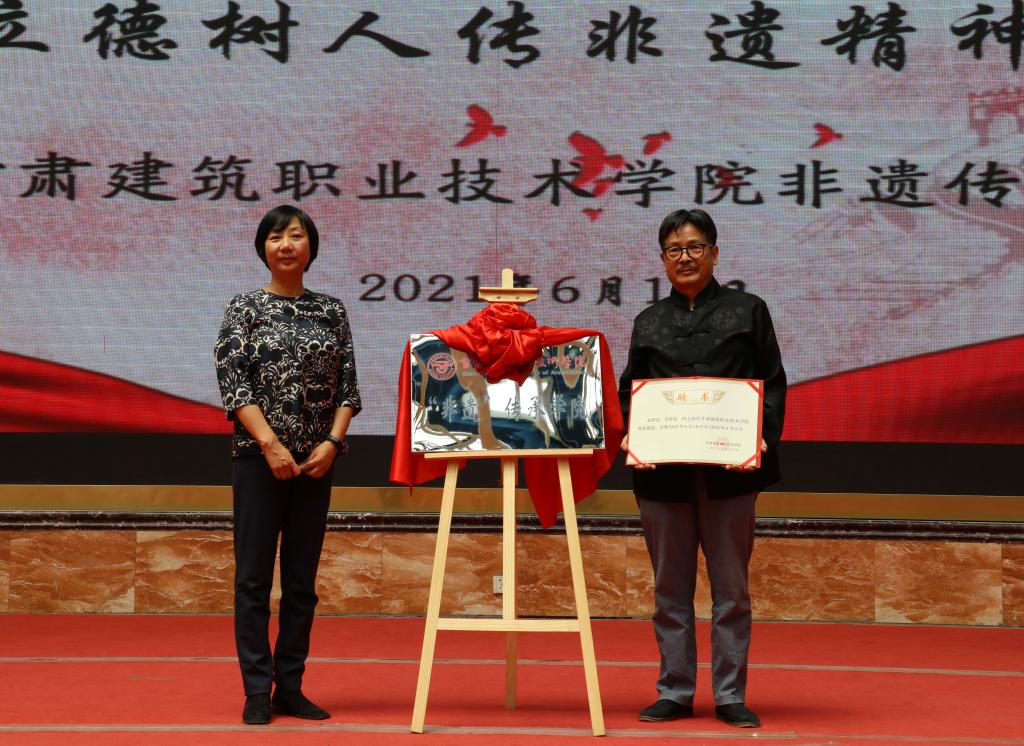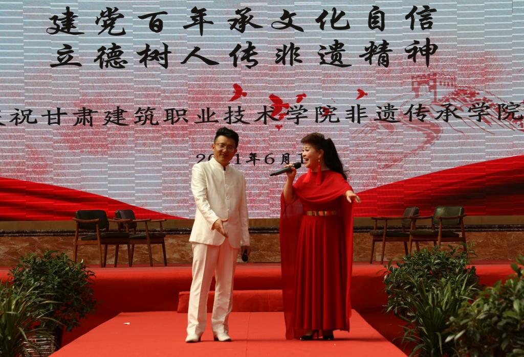 建党百年承文化自信,立德树人传非遗精神!6月10日,伴随着中国民间文艺家协会会员田野、甘肃省民间文艺家协会会员司马和曙带来的高亢、悠长、爽朗,彰显民族风格和地方特色的“花儿”精彩演唱下,甘肃建筑职业技术学院非遗传承学院成立仪式拉开序幕。甘肃省工艺美术大师、副高级雕塑艺术师常天平,敦煌壁画研究专家吴荣鉴,甘肃省高级葫芦雕刻艺术师白正兵等22名“非遗”传承人,学院党委书记、院长王娟丽,党委委员、副院长李君宏,建筑系主任杨晶等师生参加成立仪式,仪式由建筑系党总支书记蔡萍主持。