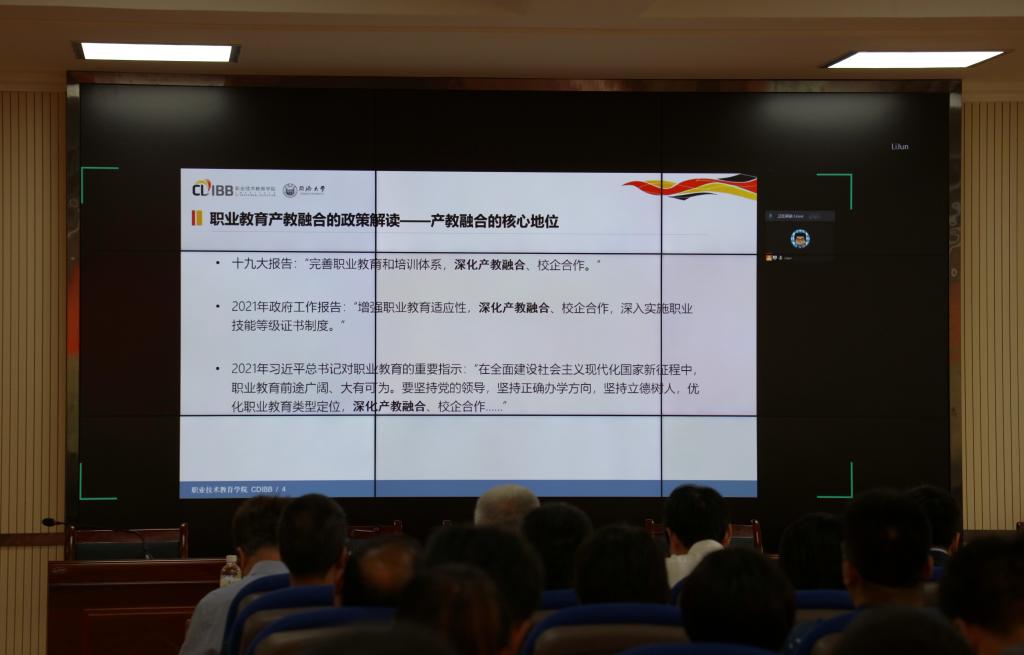 首先,同济大学职业教育学院博士李俊以录播的形式线上分享了题为《职业教育产教融合的政策解读与国际比较分析》的报告,报告从职业教育产教融合的政策解读、产教融合的核心地位和产教融合的侧重点,以及职业教育产教融合的国际比较分析,行业企业参与职业教育的形式程度,学校适应产业界需求的形式,并以德国双元化职业教育产教职合为案例,详细解读了职业教育产教融合的现状和发展趋势。总结了职业教育产教融合的启示,合理借鉴国外的经验,充分意识国外产教融合的基础条件,促进本地实践。