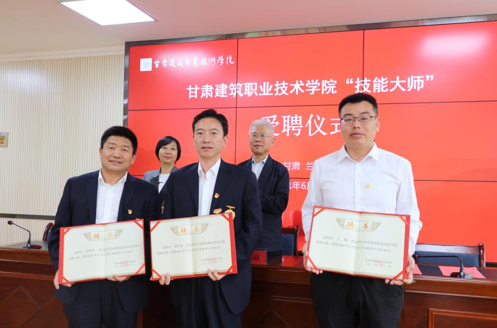 随后举行了甘肃省建筑职教集团、甘肃建筑职业技术学院“技能大师”受聘仪式,特聘甘肃第六建设集团股份有限公司智能科科长薛树春、甘肃第六建设集团股份有限公司安全科谢昌盛、北京东方雨虹防水技术股份有限公司雨虹学院副院长王巍为我院“技能大师”。