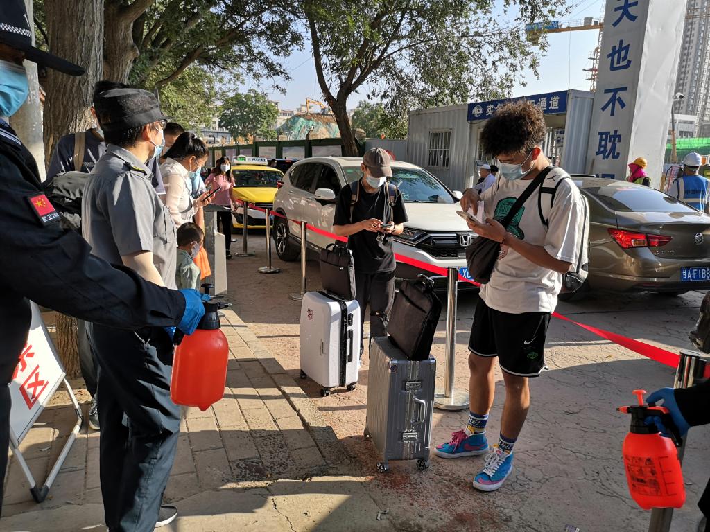 学生到达本部校门后,工作人员核验其48小时内核酸检测阴性证明、甘肃省健康出行码、国务院通信大数据行程卡及有效证件到等候区,并进行行李消毒和首次体温筛查。筛查体温无异常学生,在通过校门口人脸识别测温面板进行二次测温。二次测温体温正常学生,通过闸机进入校园后前往宿舍,并通过宿舍门口的人脸识别测温面板进行第三次测温。学生在指定地点领取行李后,辅导员组织各自班级学生办理后续报名手续。
