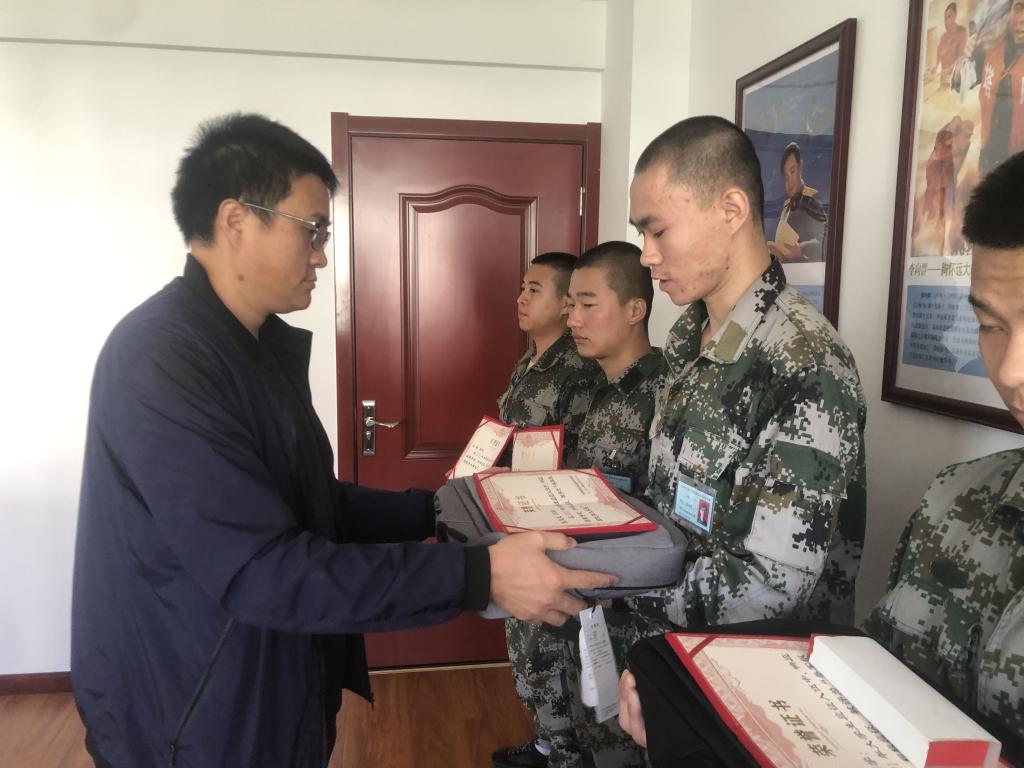 会后许庆兵、王亮同志为应征入伍的同学颁发了“参军报国优秀大学生”荣誉证书,发放了带有学院特色的纪念品双肩包和钢笔,正逢中秋佳节到来之际,学院也为同学们准备了月饼、水果等慰问品,表达了学院对同学们的祝福与祝贺。