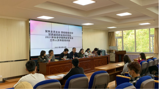 为严格落实学生会工作人员培训制度,以学生会制度落实为牵引持续深化高校学生会改革,深入贯彻落实从严治会制度,优化学生会组织工作作风,切实加强新时期学生会工作,甘肃建筑职业技术学院两级学生会以“聚焦主责主业,团结服务同学”为主题于9月28日、29日在学术报告厅召开“甘肃建筑职业技术学院2021年秋季学期两级学生会工作人员专题培训会”。团委书记张磊、六系团总支负责人以及两级学生会全体工作人员参加此次会议,会议由学生会专职秘书长董梓瑶主持。